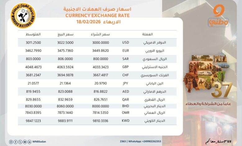 اسعار الصرف للعملات الاجنبية مقابل الجنيه السوداني من بنك العمال الوطني اليوم الأربعاء 18 فبراير