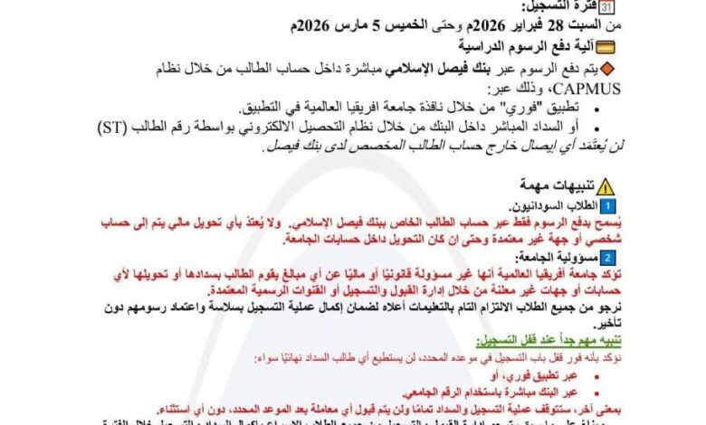 جامعة إفريقيا العالمية تعلن عن فتح إجراءات التسجيل للفصل الدراسي الأول دفعة 2024م المؤجلة