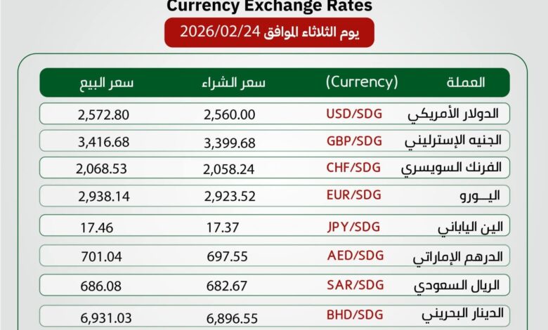 أسعار صرف العملات الأجنبية مقابل الجنيه السوداني في البنك الإسلامي السوداني اليوم الثلاثاء 24 فبراير