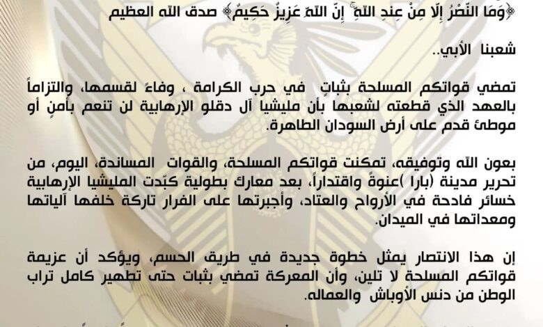 الجيش يعلن تحرير مدينة بارا بولاية شمال كردفان