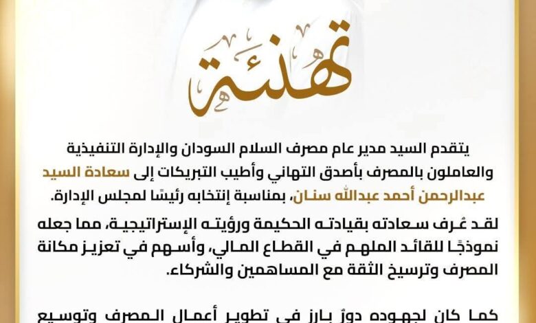أعلن مصرف السلام عن إختيار رجل الأعمال الإماراتي عبدالرحمن أحمد عبدالله سنان رئيسًا لمجلس إدارة بنك السلام – السودان ،…