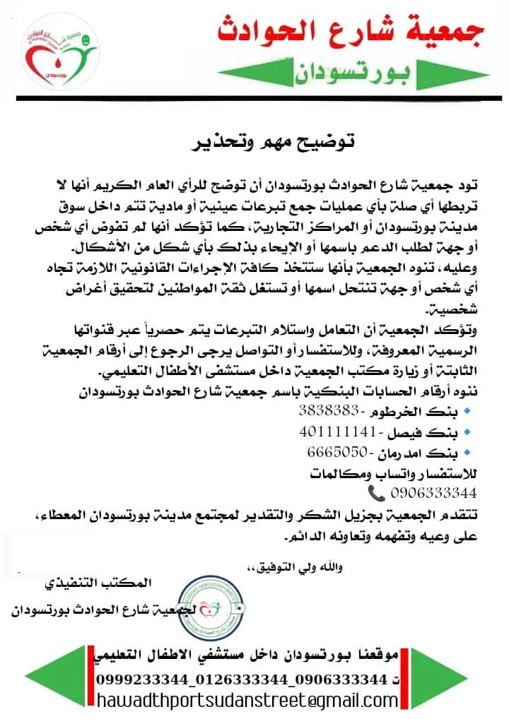 نفت جمعية شارع الحوادث بورتسودان صلتها بجمع تبرعات داخل الأسواق وأعلنت في بيان توضيحي وتحذيري موجهة للرأي العام أنها لا تربطها أي صلة بأي عمليات جمع تبرعات عينية أو مادية تتم داخل سوق مدينة بورتسودان أو المراكز التجارية، كما تؤكد أنها لم تفوض أي شخص أو جهة لطلب الدعم باسمها أو الإيحاء بذلك بأي شكل من الأشكال ، ونوهت الجمعية بأنها ستتخذ كافة الإجراءات القانونية اللازمة تجاه أي شخص أو جهة تنتحل اسمها أو تستغل ثقة المواطنين لتحقيق أغراض شخصية ، مؤكدة أن التعامل واستلام التبرعات يتم حصرياً عبر قنواتها الرسمية المعروفة، وقالت الجمعية أنه وعند الاستفسار أو التواصل يرجى الرجوع إلى أرقام الجمعية الثابتة أو زيارة مكتب الجمعية داخل مستشفى الأطفال التعليمي ببورتسودان ونبهت الجمعية الي انا أرقام حسابات البنكية باسم جمعية شارع الحوادث بورتسودان هي :