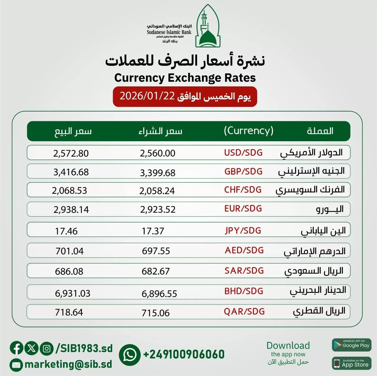 #أسعار_الصرف_للعملات_الأجنبية مقابل الجنيه السوداني لليوم الخميس الموافق 22 يناير 2026م .
