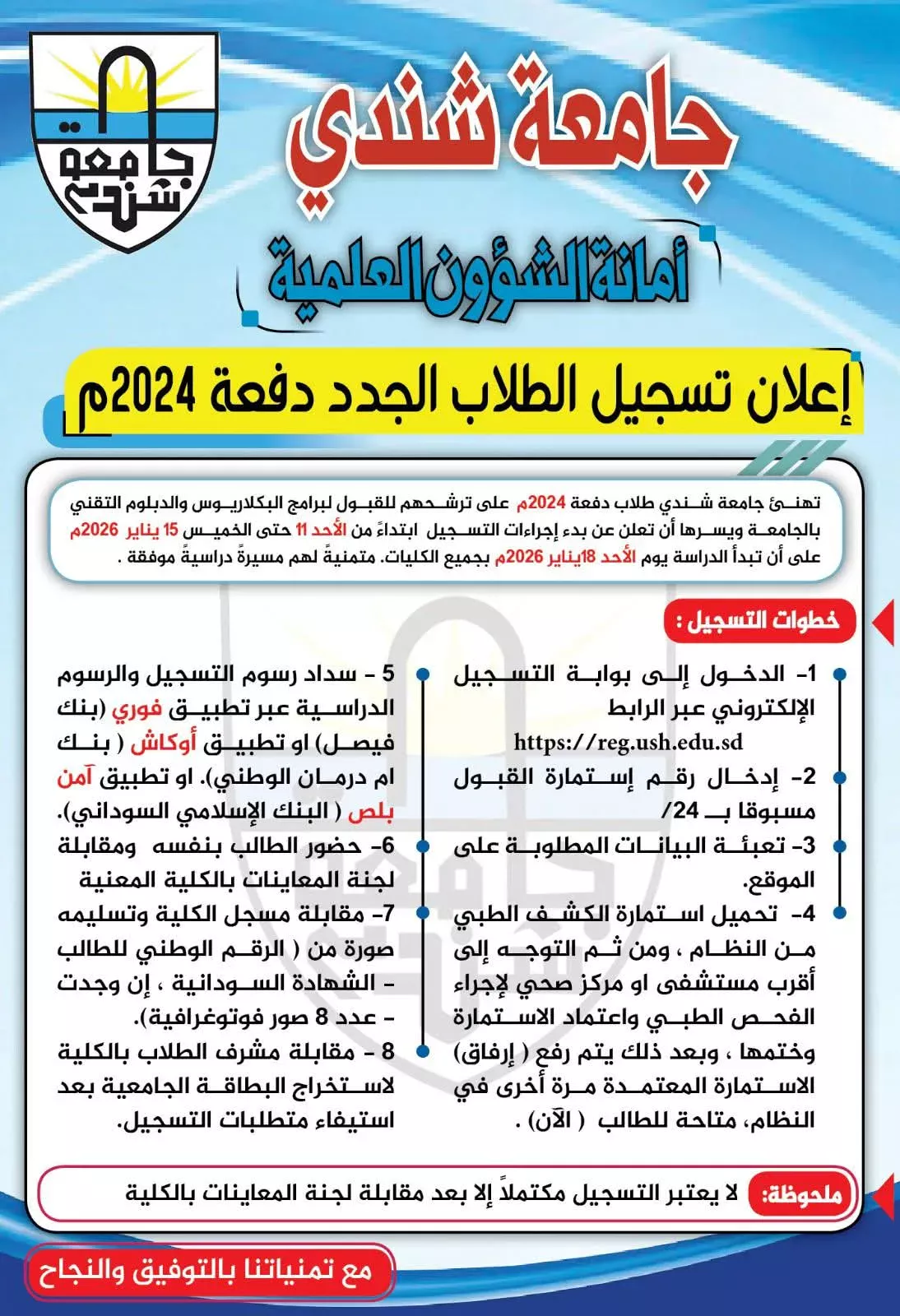 أعلنت جامعة شندي أن عملية إجراءات تسجيل الطلاب الجدد الدفعة 2024م فاقت نسبة الـ 80 % في ذات الوقت الذي قررت اللجنة العليا للإشراف علي معاينات وتسجيل الطلاب الجدد دفعة 2024م بجامعة شندي تمديد فترة إتمام عمليات التسجيل والمعاينات لمدة أسبوع للطلاب الذين أعلن مؤخراً عن نتيجة قبولهم للجامعة، إعتباراً من الأحد 25 يناير 2026م.