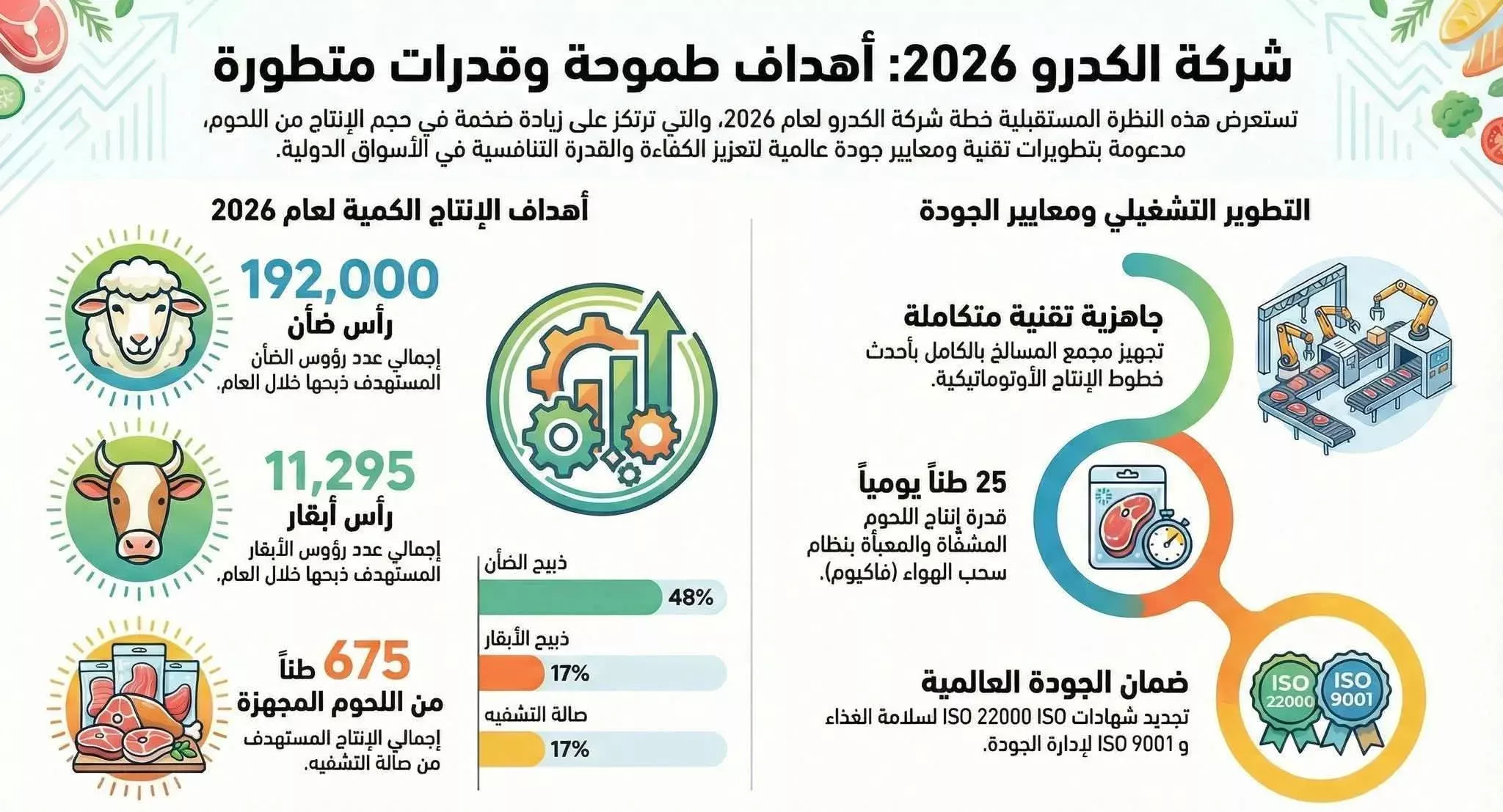 كشفت شركة الكدرو للتصنيع الغذائي التابعة لمجموعة تنمية الصادرات عن خطة شاملة لرفع القدرة التشغيلية للمصنع خلال العام (2026م( وزيادة كميات الإنتاج المستهدفة ، وذلك ووصولاً إلى أحجام الذبيح والمعالجة التالية خلال العام من خلال خط ذبيح الضأن تستهدف ذبح (192,000) رأس ، وخط ذبيح الأبقار يستهدف ذبح (11,295) رأس بجانب صالة (التشفيه) عبر استهداف إنتاج (675) طناً من اللحوم (المشفّاه) والمجهزة، ومن حيث نسب استغلال الطاقة الإنتاجية تسعى الشركة لزيادة كفاءة استخدام أصولها للوصول إلى النسب التالية من الطاقة المتاحة لاستغلال (48 %) من الطاقة المتاحة لخط ذبيح الضأن، مع استغلال (17%) من الطاقة المتاحة لكل من خط ذبيح الأبقار وصالة (التشفيه) حيث تُقدر القدرة الإنتاجية القصوى للمجمع بـ (9,000) رأس من الضأن و (1,500) رأس من العجول في الوردية الواحدة ، وفي مجال تصنيع اللحوم بتشغيل مصنع اللحوم المتخصص لتقديم منتجات مصنعة ومجمدة ، وفيما يتعلق بالجاهزية التقنية تم الانتهاء من تأهيل مجمع مسالخ الكدرو ليصبح مجهزاً بالكامل بأحدث تكنولوجيا خطوط الإنتاج الأوتوماتيكية، مما يعزز القدرة على إنتاج 25 طناً يومياً من اللحوم (المشفّاة) بنظام سحب الهواء (فاكيوم) ومن حيث معايير الجودة والرقابة الإنتاجية لضمان سلامة هذه الكميات الضخمة من الإنتاج أعلنت الشركة أنها ستعتمد على المختبرات البيطرية بتفعيل مختبر القياسات والتحاليل البيطرية داخل المسلخ لضمان سلامة المواشي وتشغيل خطوط تجهيز مخلفات الذبيح (الأحشاء) وخطوط تجفيف الدم، بالإضافة إلى محطة تنقية المياه الناتجة عن العمليات في جانب إدارة مخلفات الذبيح .