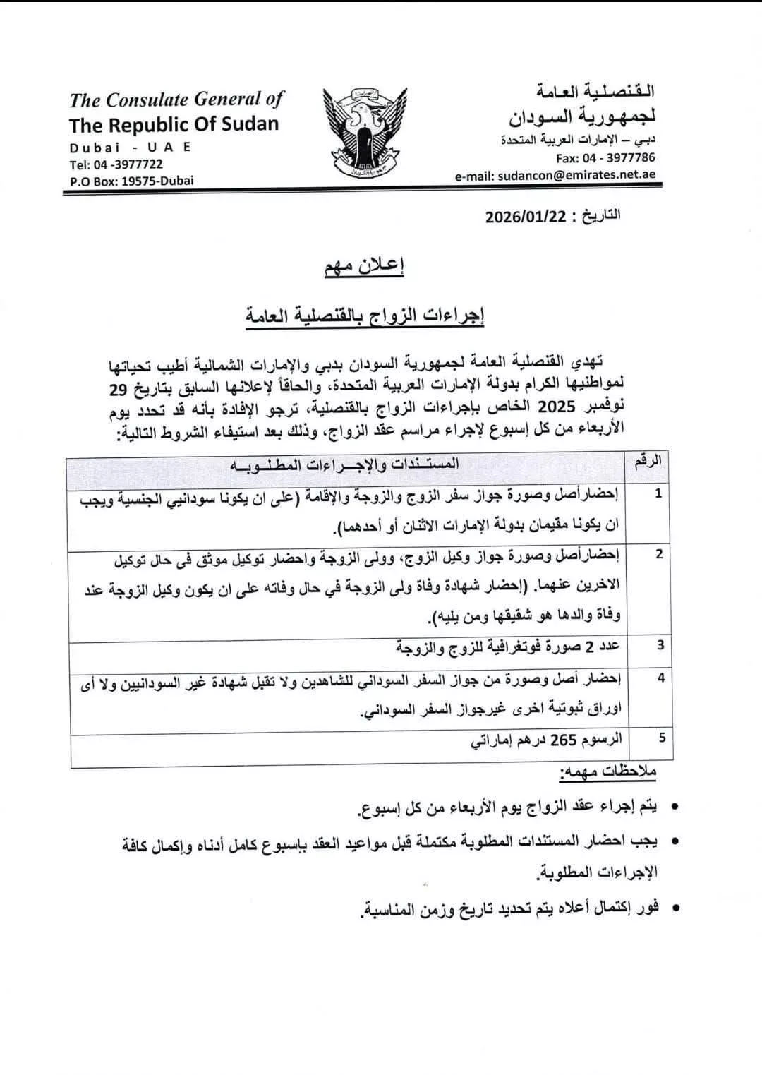 أعلنت القنصلية العامة السودانية في دبي والإمارات الشمالية عن ضوابط إجراءات الزواج بالقنصلية وحددت يوم الأربعاء من كل إسبوع موعداً لإجراء مراسم عقد الزواج، وذلك بعد استيفاء الشروط التالية: