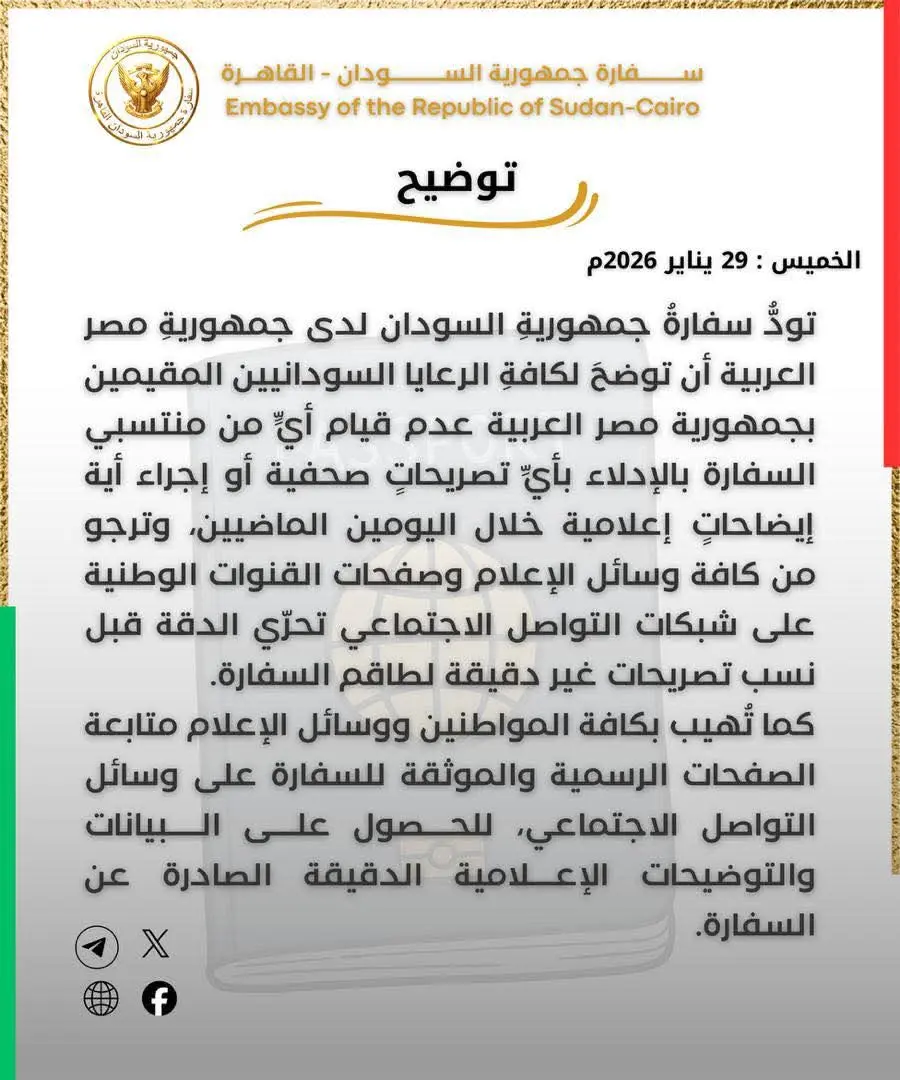 أصدرت سفارة جمهورية السودان لدى جمهورية مصر العربية توضيحاً صحفياً اليوم، نفت فيه قيام أي من طاقمها الدبلوماسي أو منتسبيها بالإدلاء بأي تصريحات إعلامية خلال اليومين الماضيين،وأكدت السفارة في بيانها الموجه للرعايا السودانيين والمؤسسات الإعلامية، عدم صدور أي إيضاحات أو تصريحات صحفية من أي مسؤول بالسفارة مؤخراً ، و طالبت السفارة كافة القنوات الوطنية ومنصات التواصل الاجتماعي بضرورة تحري الدقة والمهنية قبل نسبة أي أخبار أو تصريحات لطاقم البعثة ، و أهابت السفارة بالمواطنين استقاء المعلومات والبيانات الصحيحة حصراً عبر الصفحات الرسمية الموثقة للسفارة على منصات التواصل الاجتماعي، ويأتي هذا التوضيح في إطار حرص السفارة على تمليك الحقائق للجمهور ومنع انتشار الشائعات أو المعلومات غير الدقيقة التي قد تنسب لمنتسبيها.
