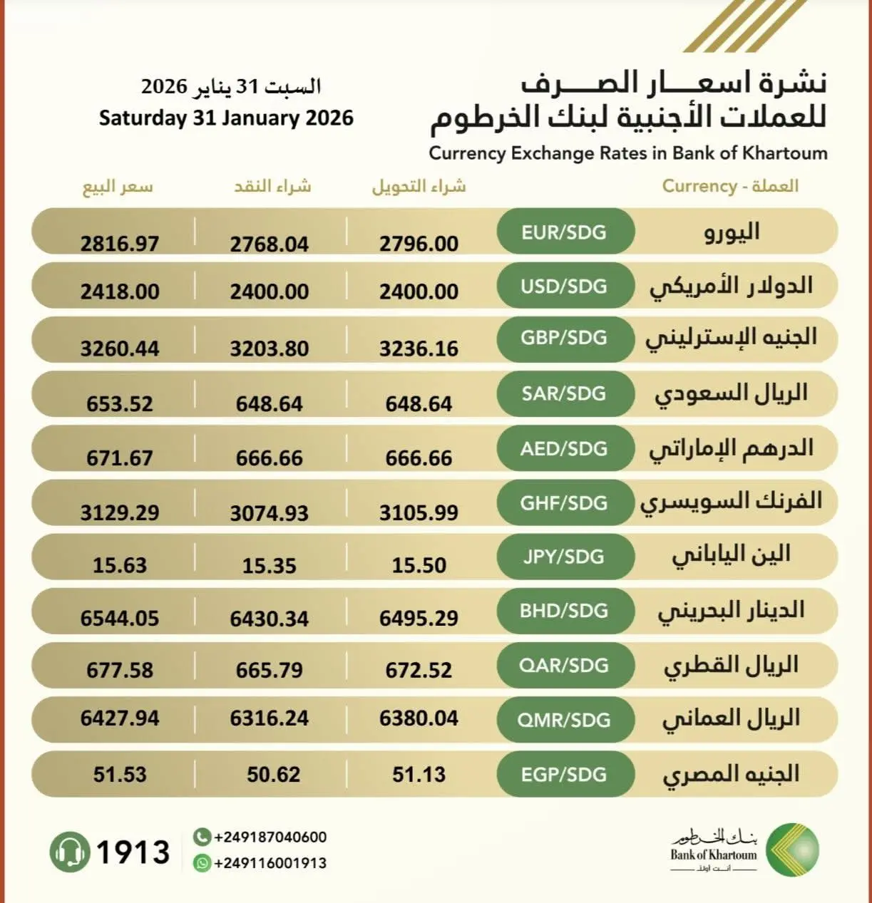 نشرة #اسعار_الصرف_للعملات_الاجنبية في بنك الخرطوم ليوم السبت، الموافق 31 يناير 2026م.