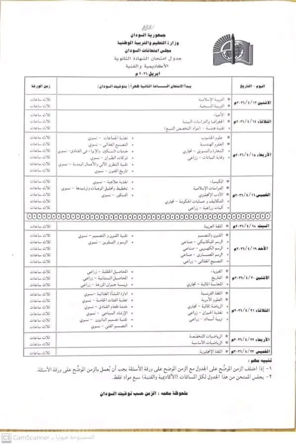 اعلنت وزارة التعليم والتربية الوطنية عن جدول امتحانات الشهادة الثانوية 2026م المحدد إنعقادها في الثالث عشر من أبريل المقبل .