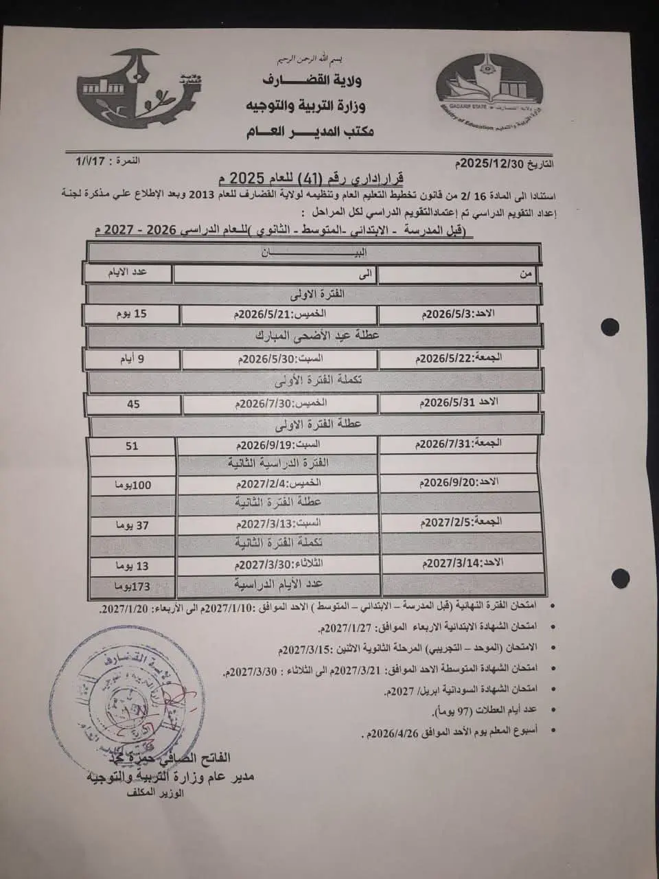 وزارة التربية بولاية القضارف تُعلن التقويم الدراسي للعام (2026 – 2027)م