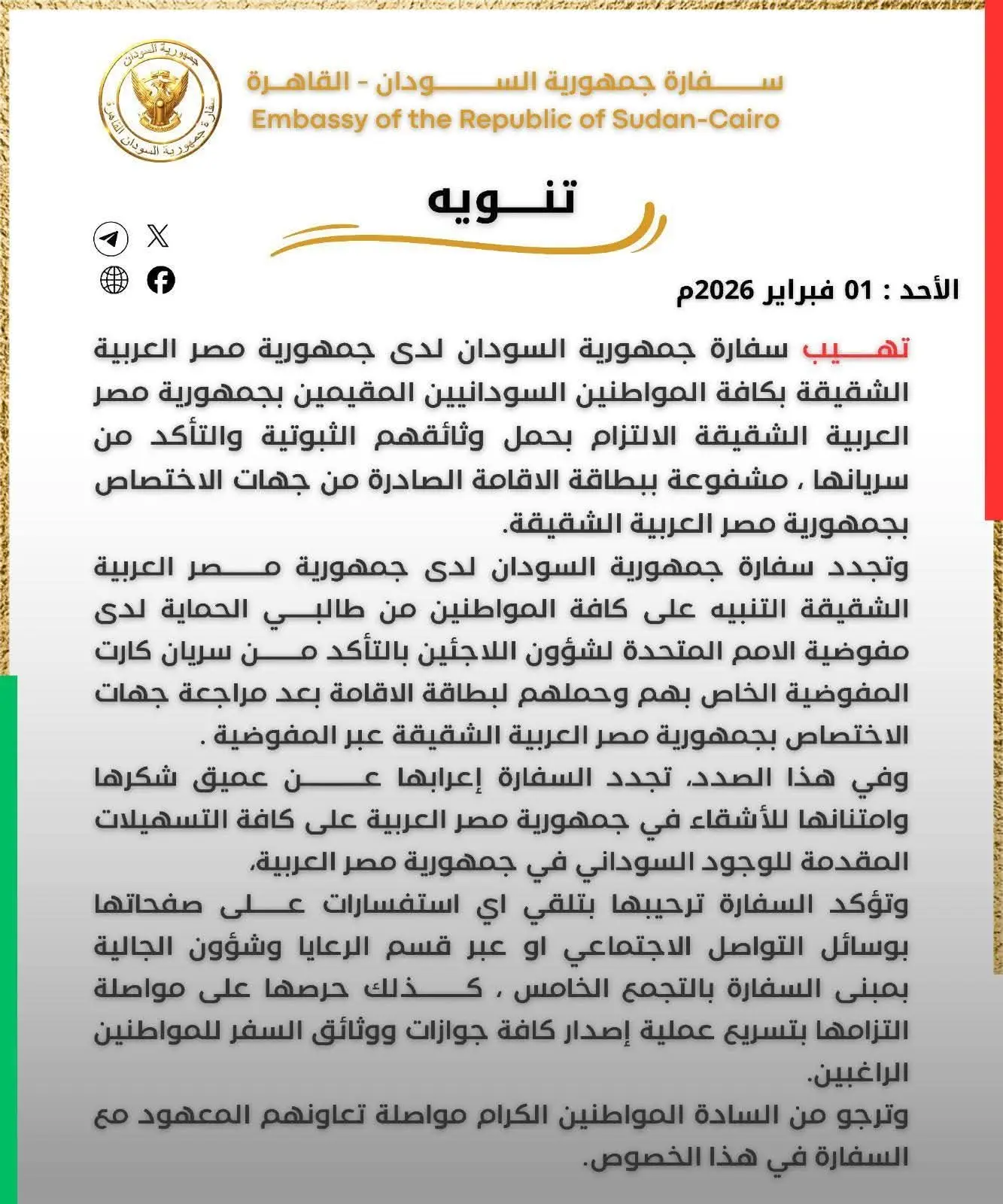 أصدرت السفارة السودانية لدى القاهرة تنويهاً مهماً اليوم الأحد 1 فبراير ، أهابت فيه بكافة المواطنين السودانيين المقيمين في مصر بضرورة الالتزام بحمل وثائقهم الثبوتية والتأكد من سريان مفعولها، إلى جانب حمل بطاقة الإقامة الصادرة عن الجهات المصرية المختصة ، وشددت السفارة على طالبي الحماية لدى مفوضية الأمم المتحدة لشؤون اللاجئين بضرورة التأكد من سريان “كارت المفوضية” والحصول على بطاقة الإقامة بالتنسيق مع الجهات المختصة عبر المفوضية، وأكدت السفارة حرصها التام على تسريع عمليات إصدار جوازات ووثائق السفر للمواطنين، مرحبةً بأي استفسارات عبر منصاتها الرسمية أو قسم الرعايا بمقرها في منطقة التجمع الخامس ، وأعربت السفارة عن عميق تقديرها وامتنانها لجمهورية مصر العربية، قيادةً وشعباً، على ما يقدمونه من تسهيلات ودعم للوجود السوداني على أراضيها ، واختتمت السفارة بيانها بدعوة المواطنين إلى مواصلة تعاونهم المعهود مع البعثة الدبلوماسية، والالتزام بالضوابط القانونية المنظمة للإقامة لضمان استقرار أوضاعهم.