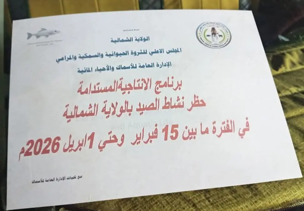 حظرت الولاية الشمالية نشاط صيد الأسماك في جميع أنحاء الولاية لمدة 45 يوماً وذلك بجميع أنحاء الولاية خلال الفترة من 15 فبراير وحتى 1 أبريل 2026م حماية للثروة السمكية ، وأكدت الادارة العامة للأسماك و الأحياء المائية أن القرار يأتي تزامناً مع مواسم التكاثر الطبيعي للأسماك بما يسهم في الحفاظ على المخزون السمكي وضمان إستدامته للأجيال القادمة وتنظيم استغلال الموارد المائية.