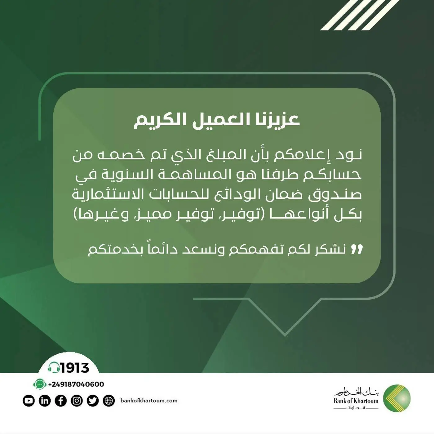 نود إعلامكم بأن المبلغ الذي تم خصمه من حسابكم طرفنا، هو المساهمة السنوية في صندوق ضمان الودائع للحسابات الاستثمارية بكل أنواعها (توفير، توفير مميز، وغيرها).