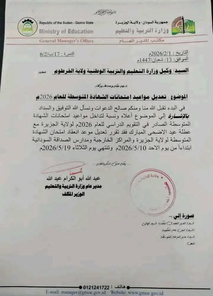 تعديل موعد انعقاد إمتحانات الشهادة المتوسطة لولاية الجزيرة والمراكز الخارجية ومدارس الصداقة السودانية للعام 2026م الي يوم 10 مايو وحتي 19 مايو 2026.
