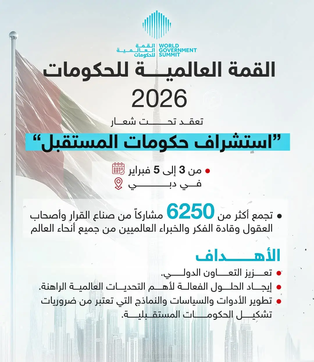 تحتضن مدينة دُبي بالإمارات أعمال القمة العالمية للحكومات للعام 2026م والتي تجئ تحت شعار (استشراف حكومات المستقبل) وذلك في الفترة من 3 – 5 فبراير الجاري ، وذلك بمشاركة 6250 خبيراً من صناع القرار علي مستوي العالم ، حيث تهدف القمة إلي ترسيخ مبدأ التعاون الدولي ومحاولة إيجاد الحلول الفعالة للتحديات العالمية الراهنة ، علاوة علي تطوير الأدوات والآليات والنماذج التي تعتبر من ضرورات تشكيل الحكومات المستقبلية .