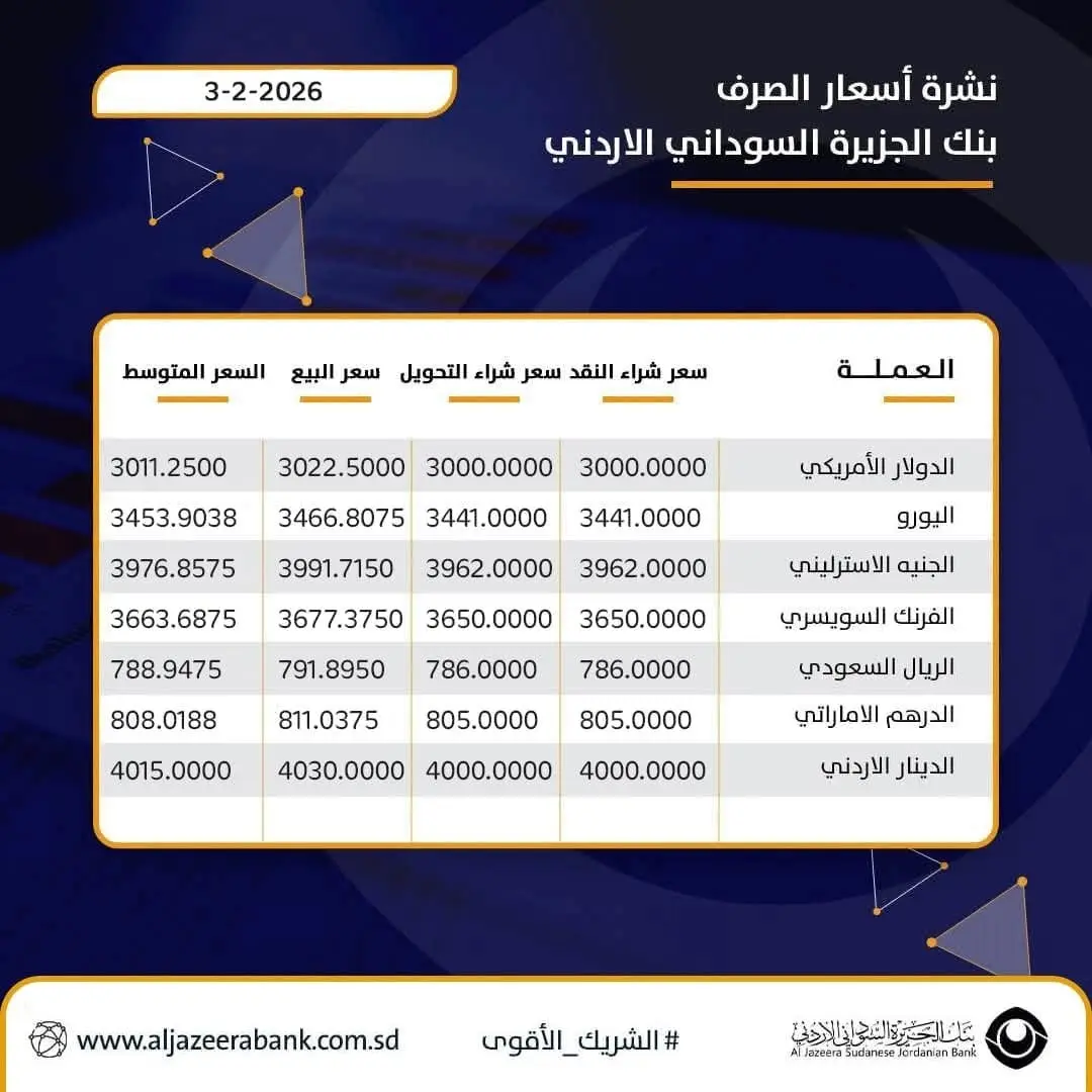 #نشرة_أسعار_صرف_العملات_الأجنبية‬⁩ مقابل الجنيه السوداني ‏اليوم الثلاثاء 3 فبراير 2026م في بنك الجزيرة السوداني الأردني.
