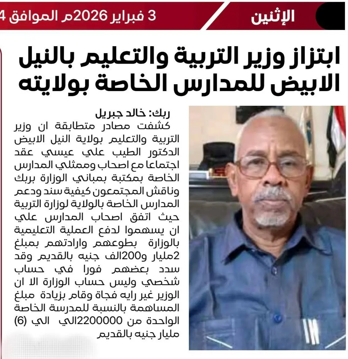 وزير التربية بالنيل الأبيض يطالب المدارس الخاصة بتوريد مليارات الجنيهات في حسابه الخاص