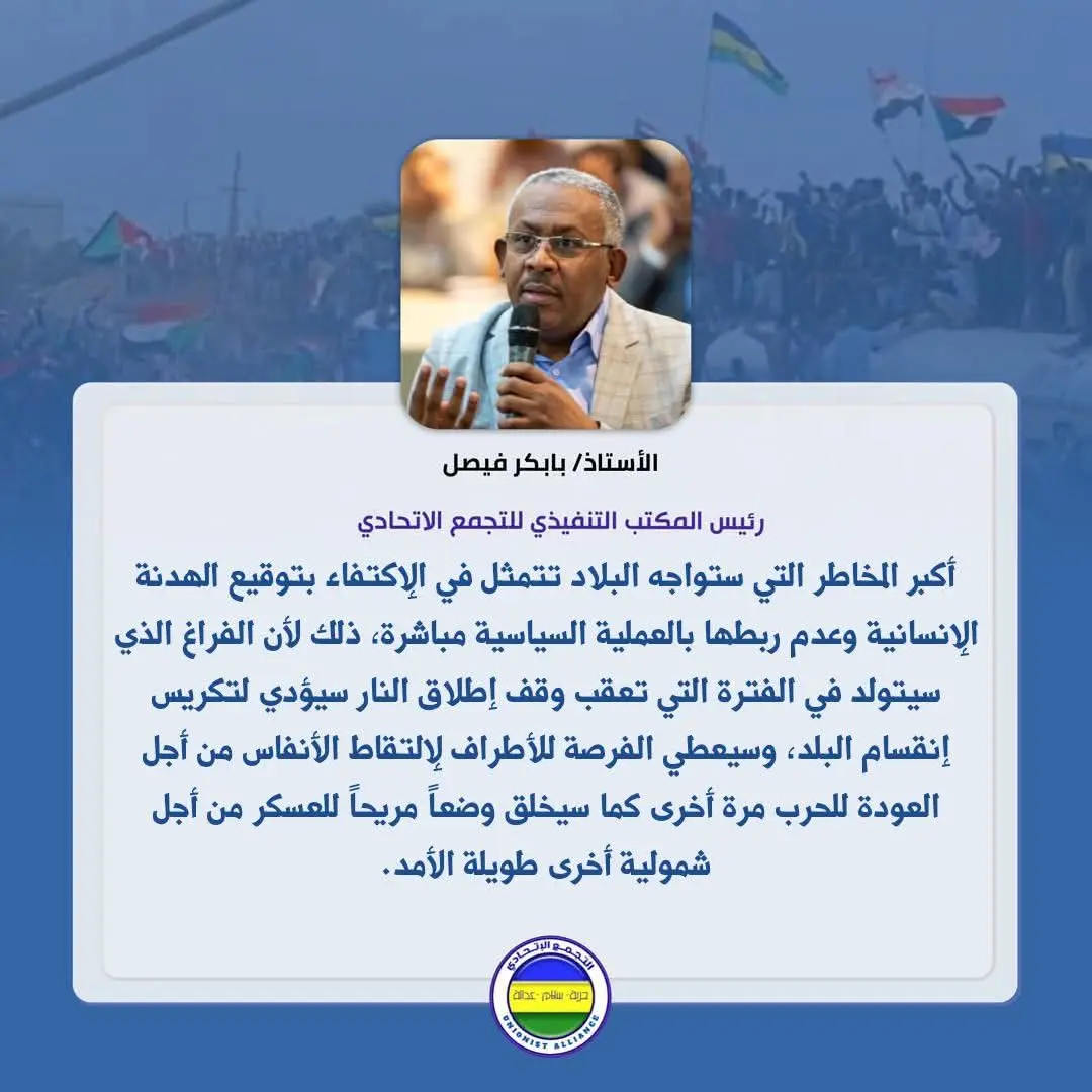 – أكبر المخاطر التي ستواجه البلاد تتمثل في الإكتفاء بتوقيع الهدنة الإنسانية وعدم ربطها بالعملية السياسية مباشرة, ذلك لأن الفراغ الذي سيتولد في الفترة التي تعقب وقف إطلاق النار سيؤدي لتكريس إنقسام البلد, وسيعطي الفرصة للأطراف لإلتقاط الأنفاس من أجل العودة للحرب مرة أخرى كما سيخلق وضعاً مريحاً للعسكر من أجل شمولية أخرى طويلة الأمد.