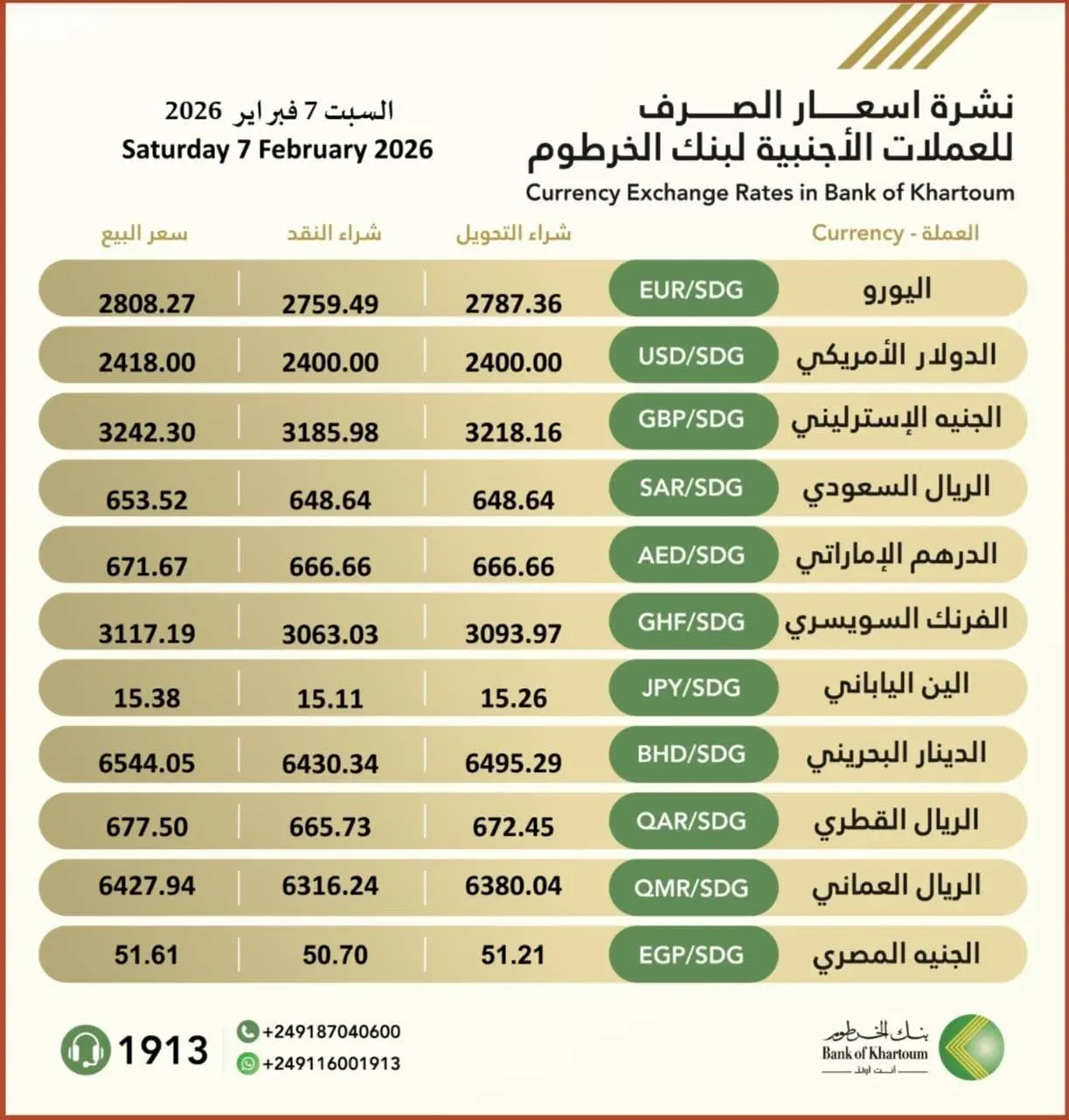 Currency #Exchange_Rates in Bank of Khartoum, On Saturday, 7 February 2026