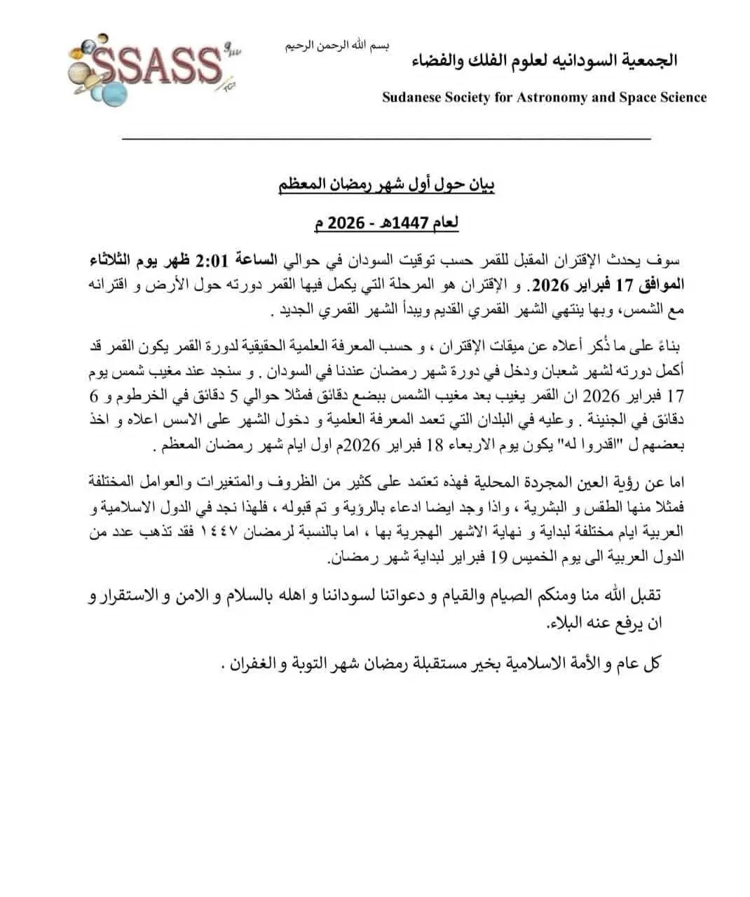 أصدرت الجمعية السودانية لعلوم الفلك والفضاء بيانا اليوم أوضحت فيه أن حدوث الاقتران المقبل للقمر سيتم حوالي الساعة 2:01 ظهر يوم الثلاثاء الموافق 17 فبراير 2026 م وهو المرحلة التي يكمل فيها القمر دورته حول الأرض فيكون القمر قد أكمل دورته لشهر شعبان ودخل في دورة شهر رمضان في السودان ، وأوضح البيان إنه في البلدان التي تعمد المعرفة العلمية ودخول الشهر على هذه الأسس يكون يوم الأربعاء 18 فبراير 2026 م أول أيام شهر رمضان المعظم .وأضاف البيان إن رؤية العين المجردة المحلية تعتمد على كثير من الظروف والمتغيرات والعوامل المختلفة كالطقس .