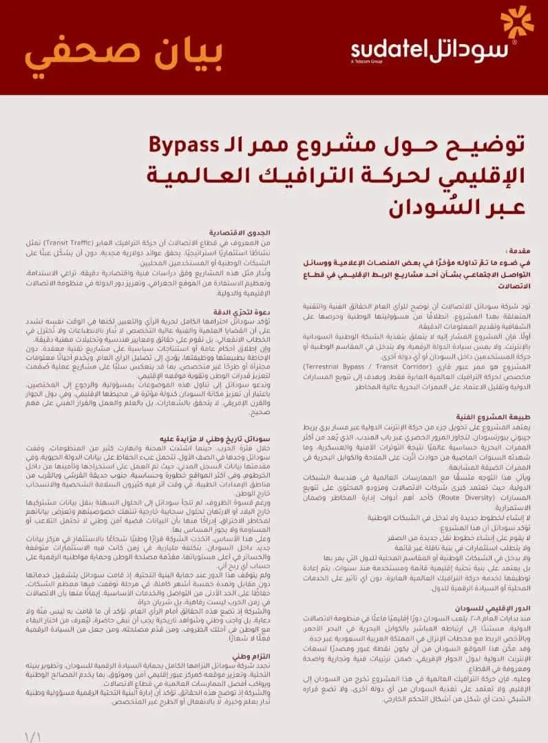 تجدد شركة سوداتل التزامها الكامل بحماية السيادة الرقمية للسودان، وتطوير بنيته التحتية، وتعزيز موقعه كمركز عبور إقليمي أمن وموثوق بما يخدم المصالح الوطنية ويواكب أفضل الممارسات العالمية في قطاع الاتصالات. والشركة إذ توضح هذه الحقائق، تؤكد أن إدارة البنية التحتية الرقمية مسؤولية وطنية تدار بعلم وخبرة لا بالانفعال أو الطرح غير المتخصص.