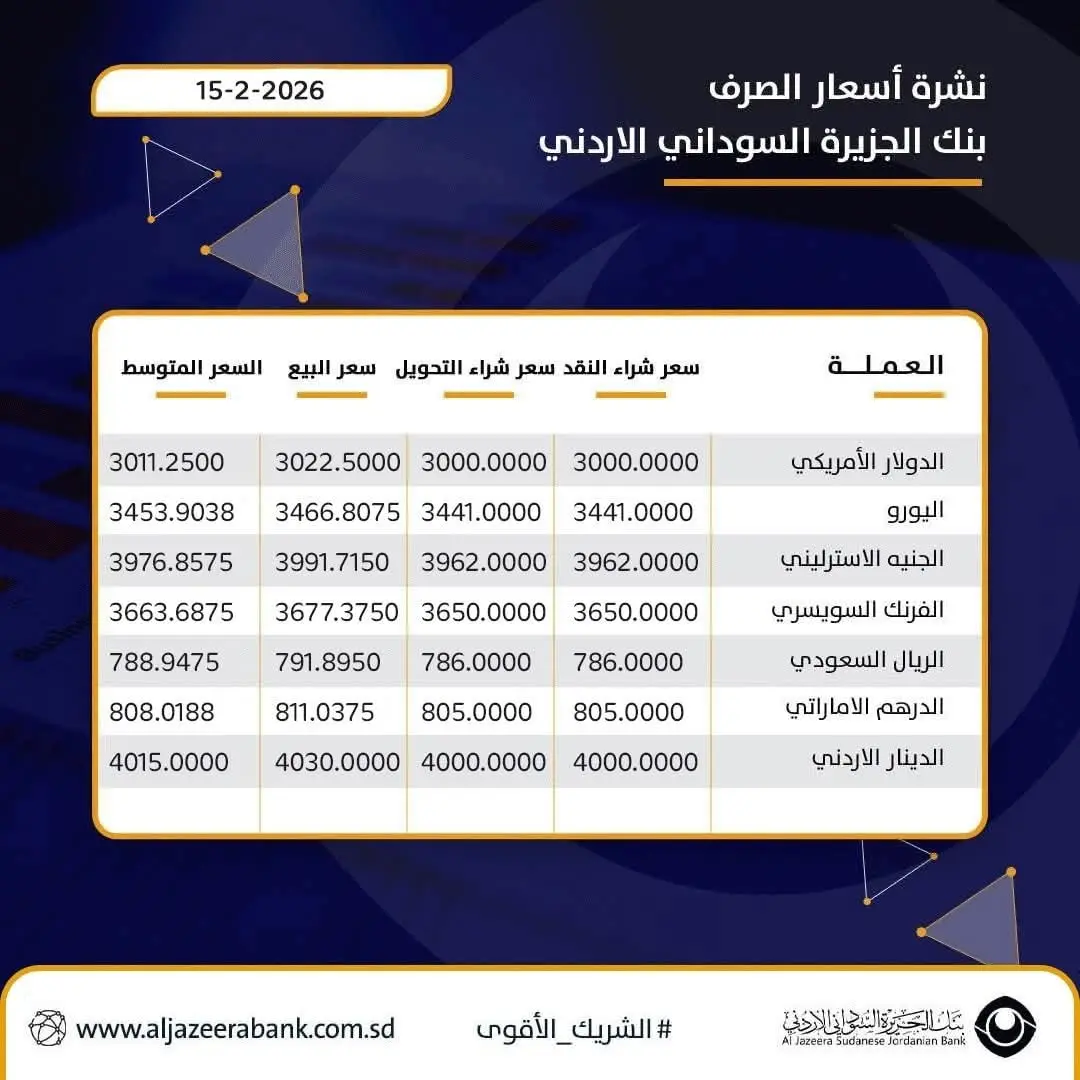 أسعار صرف العملات الأجنبية مقابل الجنيه السوداني في بنك الجزيرة السوداني الاردني اليوم الأحد 15 فبراير