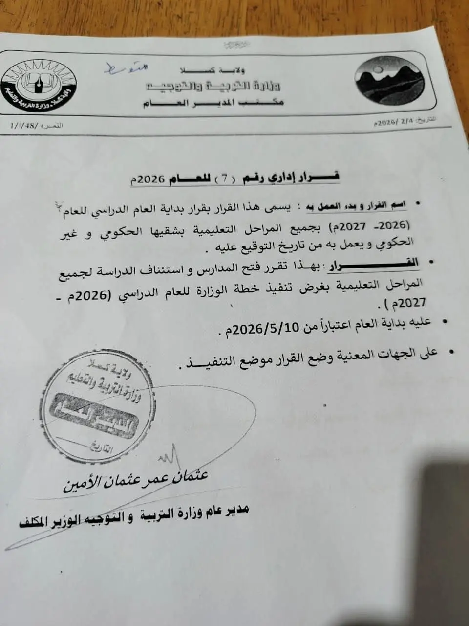 10 مايو 2026م موعداً لبداية العام الدراسي الجديد (2026 – 2027) م بجميع مدارس ومحليات ولاية كسلا