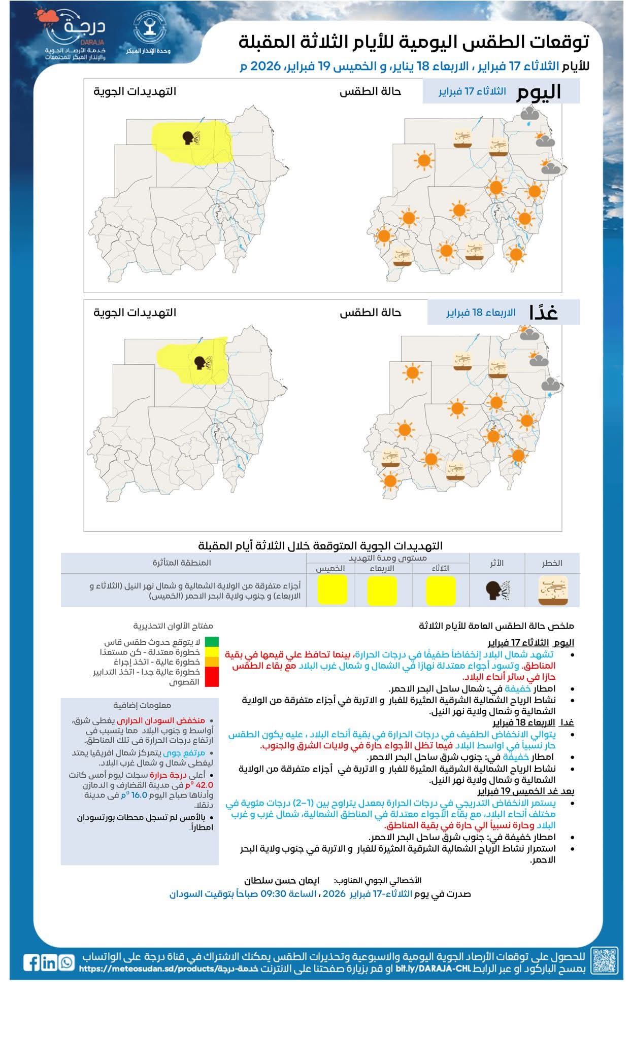 نشرت الهيئة العامة للأرصاد الجوية تقرير أحوال الطقس لليوم الثلاثاء 17 فبراير وقالت إن شمال البلاد يشهد إنخفاضاً طفيفًا في درجات الحرارة، بينما تحافظ علي قيمها في بقية المناطق وتسود أجواء معتدلة نهارًا في الشمال و شمال غرب البلاد مع بقاء الطقس حارًا في سائر أنحاء البلاد، مع هطول امطار خفيفة في شمال ساحل البحر الاحمر ، ونشاط الرياح الشمالية الشرقية المثيرة للغبار والاتربة في أجزاء متفرقة من الولاية الشمالية وشمال ولاية نهر النيل وفي يوم غدٍ الأربعاء توقعت الهيئة أن يتوالي الانخفاض الطفيف في درجات الحرارة في بقية أنحاء البلاد ، عليه يكون الطقس حار نسبياً في اواسط البلاد فيما تظل الأجواء حارة في ولايات الشرق والجنوب ، مع امطار خفيفة في جنوب شرق ساحل البحر الاحمر ، واستمرار نشاط الرياح الشمالية الشرقية المثيرة للغبار و الاتربة في أجزاء متفرقة من الولاية الشمالية، وفي يوم الخميس 19 فبراير توقعت الهيئة أن يستمر الانخفاض التدريجي في درجات الحرارة بمعدل يتراوح بين (1–2) درجات مئوية في مختلف أنحاء البلاد، مع بقاء الأجواء معتدلة في المناطق الشمالية، شمال غرب و غرب البلاد وحارة نسبياً الي حارة في بقية المناطق ، مع هطول امطار خفيفة في جنوب شرق ساحل البحر الاحمر ، ونشاط الرياح الشمالية الشرقية المثيرة للغبار و الاتربة في جنوب ولاية البحر الاحمر.