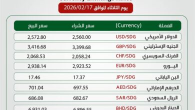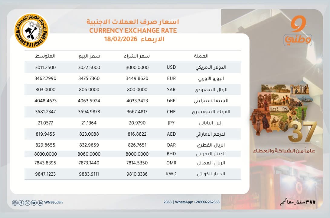 اسعار الصرف للعملات الاجنبية مقابل الجنيه السوداني من بنك العمال الوطني اليوم الأربعاء 18 فبراير