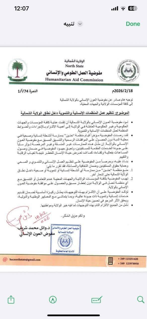 1. منع منظمة “حنين” من ممارسة أي أنشطة إنسانية أو تنموية داخل نطاق الولاية الشمالية حتى إشعار آخر.
