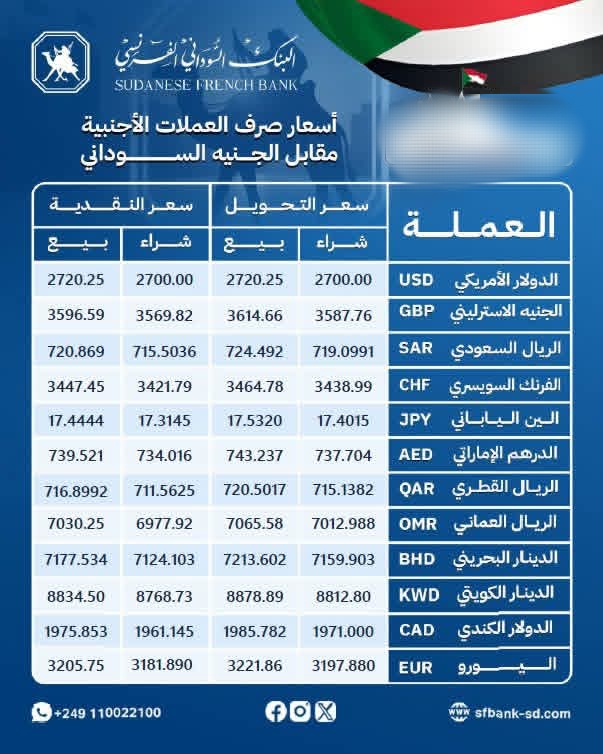 قائمة #أسعار_صرف_العملات_الأجنبية من البنك السوداني الفرنسي