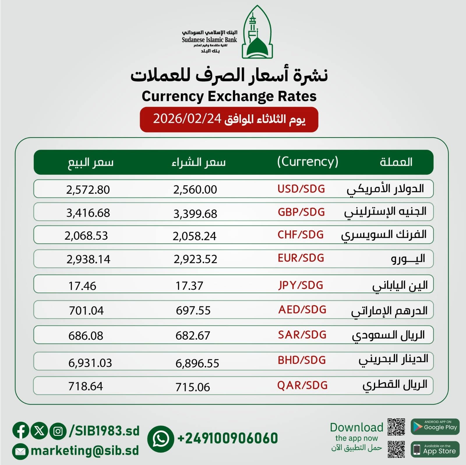 أسعار صرف العملات الأجنبية مقابل الجنيه السوداني في البنك الإسلامي السوداني اليوم الثلاثاء 24 فبراير