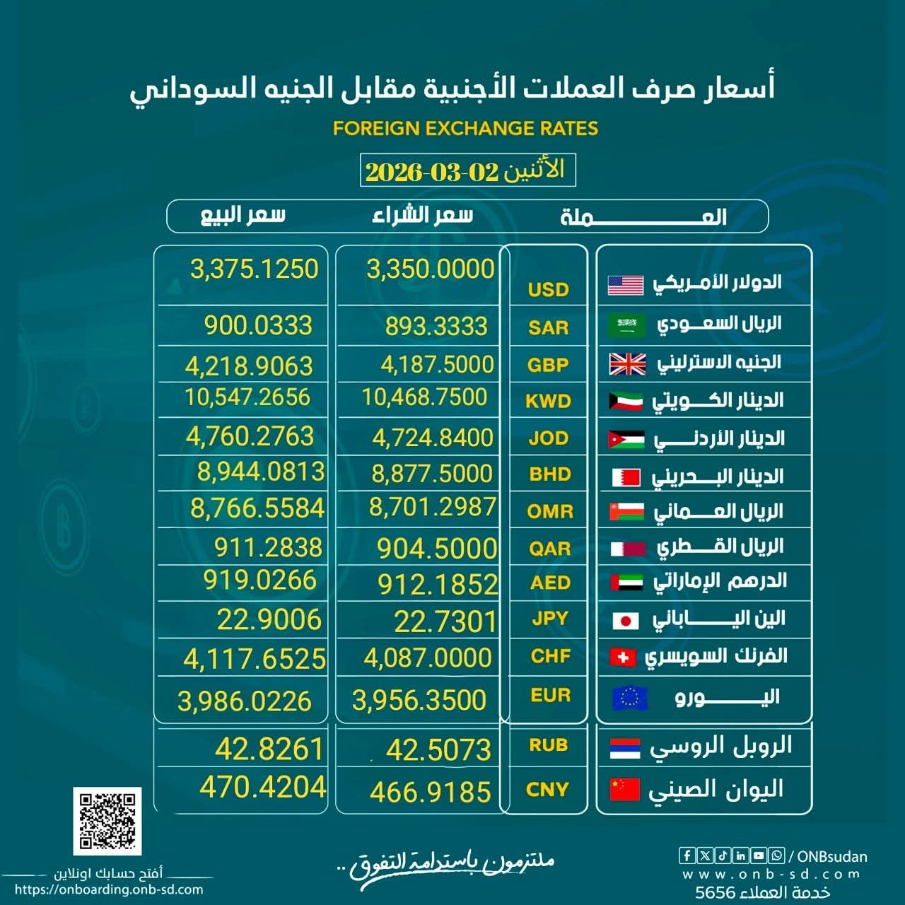 نشرة #أسعار_العملات الأجنبية مقابل الجنيه السوداني من #بنك_أمدرمان_الوطني ليوم الأثنين 02 مارس 2026م