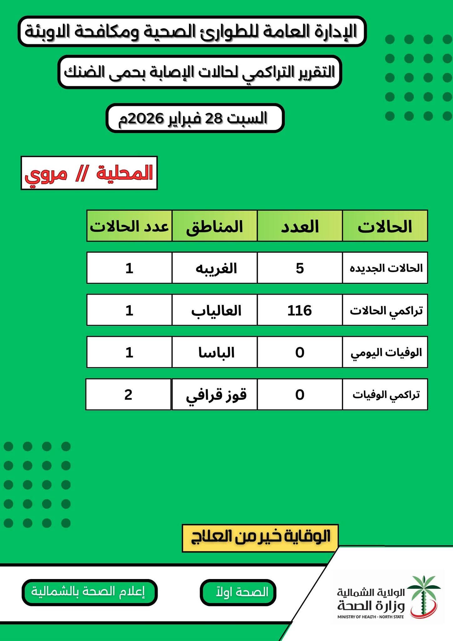 وأوضح التقرير التراكمي لحالات الإصابة بحمى الضنك، أن الولاية سجلت حتي الأحد ١ مارس ٢٠٢٦م، عدد (١١٦) حالة، وأشار التقرير إلى أن الحالات الجديدة سجلت بمناطق الغريبة (١) حالة، والعالياب (١) حالة، والباسا(١) حالة، إلى جانب تسجيل عدد (٢) حالة بمنطقة قوز قرافي، بمحلية مروي، وأكد التقرير التراكمي لحالات حمى الضنك، عدم تسجيل أي حالة وفاة حتي الآن.