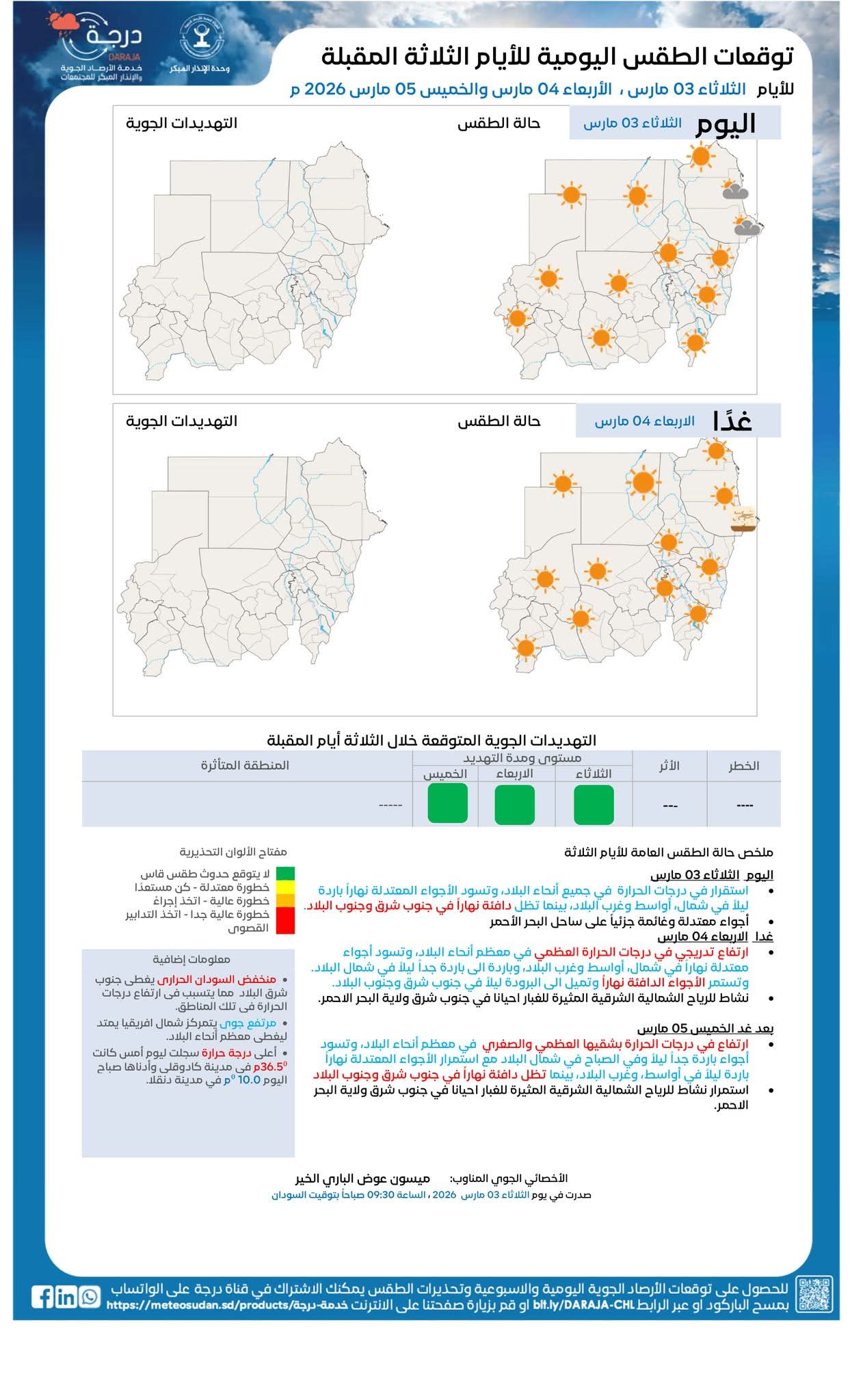 وتوقعت الهيئة إرتفاعاً تدريحياً في درجات الحرارة العظمي في معظم أنحاء البلاد يوم غد الأربعاء حيث تسود أجواء معتدلة نهاراً في شمال، أواسط وغرب البلاد، وباردة الى باردة جداً ليلاً في شمال البلاد. وتستمر الأجواء الدافئة نهاراً وتميل الى البرودة ليلاً في جنوب شرق وجنوب البلاد، مع نشاط للرياح الشمالية الشرقية المثيرة للغبار احيانا في جنوب شرق ولاية البحر الاحمر، مع استمرار الأجواء المعتدلة نهاراً و تميل للبرودة ليلاً في أواسط، وغرب البلاد، بينما تظل دافئة نهاراً في جنوب شرق وجنوب البلاد يوم الخميس 5 مارس واستمرار نشاط للرياح الشمالية الشرقية المثيرة للغبار احيانا في جنوب شرق ولاية البحر الاحمر.