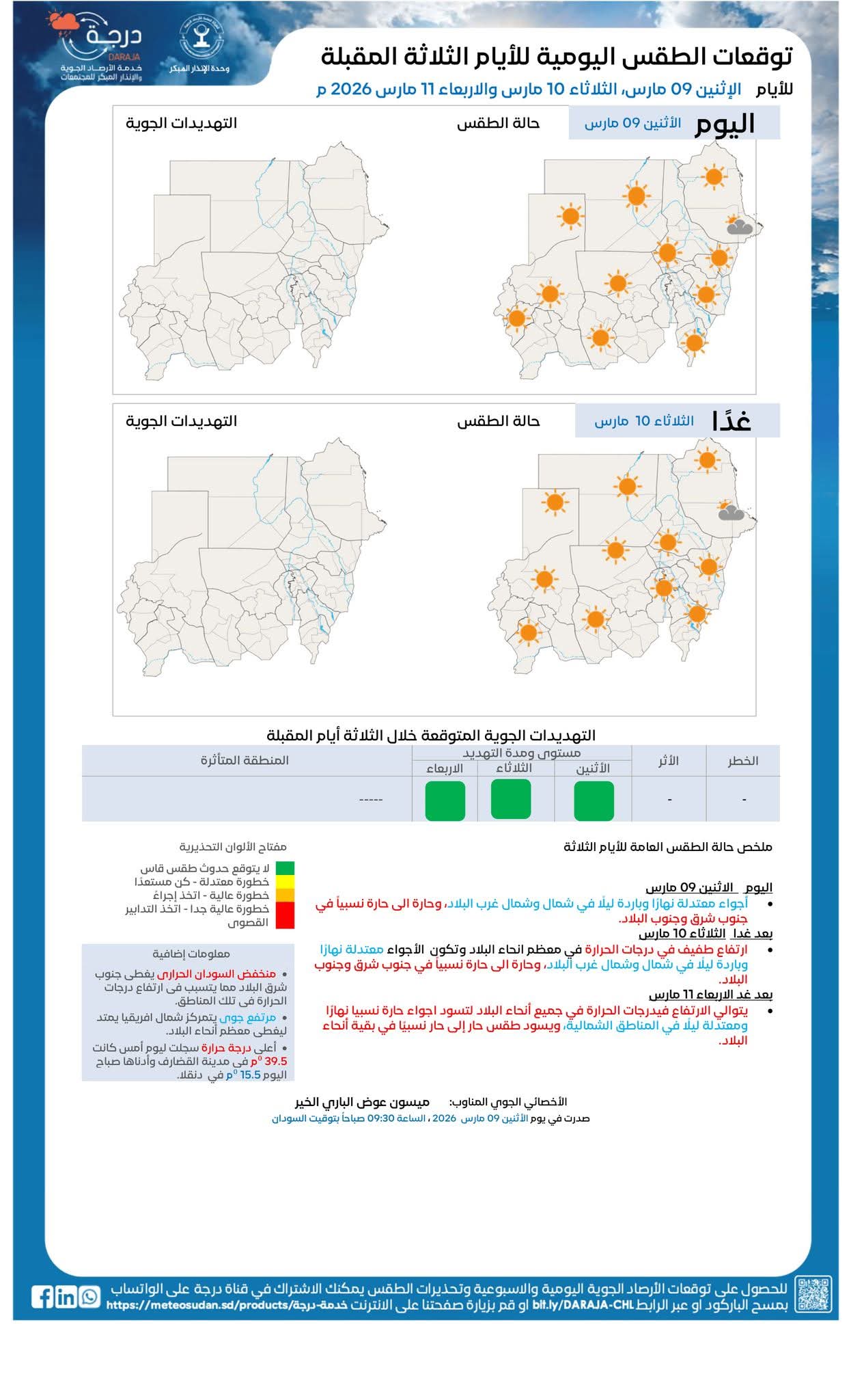 أصدرت الهيئة العامة للأرصاد الجوية السودانية تقريرها عن تقلبات الطقس والأحوال الجوية اليومية للأيام الثلاثة المقبلة (الإثنين ،الثلاثاء ، والاربعاء) ، وقالت الهيئة في نشرتها عن حالة الطقس العامة اليوم الأثنين 9 مارس إن الأجواء ستكون معتدلة نهارًا وباردة ليلًا في شمال وشمال غرب البلاد، وحارة الى حارة نسبياً في جنوب شرق وجنوب البلاد، فيما توقعت الهيئة ارتفاعاً طفيفاً في درجات الحرارة في معظم أنحاء البلاد وتكون الاجواء معتدلة نهارًا وباردة ليلًا في شمال وشمال غرب البلاد، وحارة الى حارة نسبياً في جنوب شرق وجنوب البلاد اليوم الثلاثاء 10 مارس ، وقالت الهيئة إن درجة الحرارة ستسجل يوم الأربعاء 11 مارس إرتفاعاً طفيفاً في معظم أنحاء البلاد وتكون الاجواء معتدلة نهارًا وباردة ليلًا في شمال وشمال غرب البلاد، وحارة الى حارة نسبياً في جنوب شرق وجنوب البلاد.