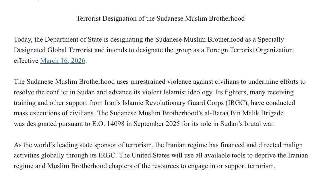 اليوم تقوم وزارة الخارجية الأمريكية بتصنيف جماعة الإخوان المسلمين السودانية كـكيان إرهابي عالمي مُصنَّف بشكل خاص، وتعتزم أيضاً تصنيف الجماعة كـمنظمة إرهابية أجنبية (FTO)، على أن يدخل القرار حيّز التنفيذ في 16 مارس 2026.
