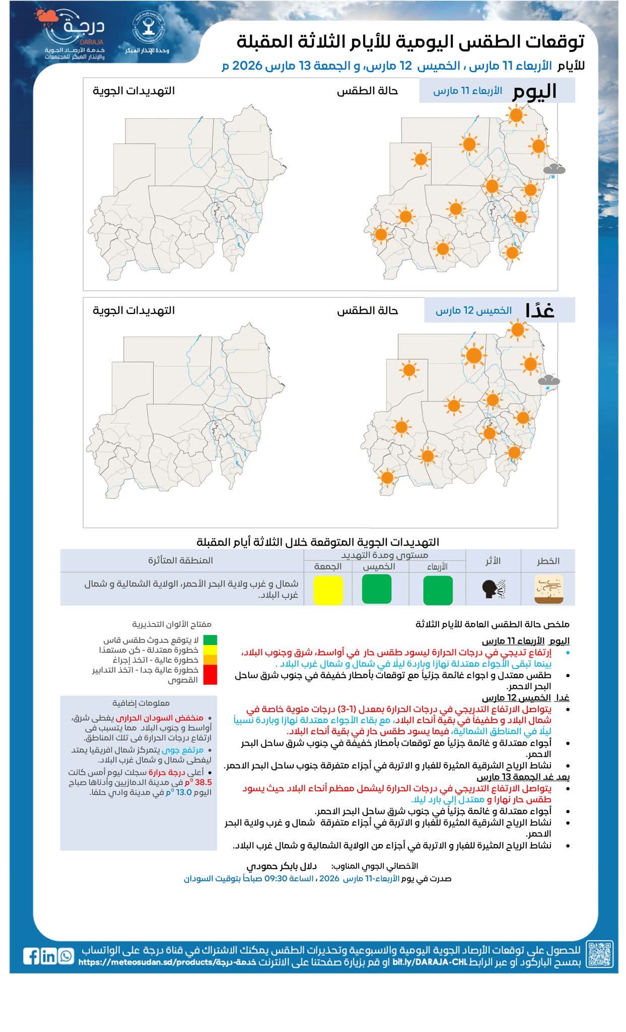 أصدرت الهيئة العامة للأرصاد الجوية السودانية تقريرها عن تقلبات الطقس والأحوال الجوية في البلاد خلال اليوم الأربعاء ويومي الخميس والجمعة ، وتوقعت الهيئة في نشرتها التي أصدرتها اليوم الأربعاء إرتفاعاً تديجياً في درجات الحرارة ليسود طقس حار في أواسط، شرق وجنوب البلاد، بينما تبقى الأجواء معتدلة نهارًا وباردة ليلًا في شمال و شمال غرب البلاد وطقس معتدل و أجواء غائمة جزئياً مع توقعات بأمطار خفيفة في جنوب شرق ساحل البحر الاحمر ، فيما ييتواصل الإرتفاع التدريجي في درجات الحرارة بمعدل (1- 3) درجات مئوية يوم غد الخميس 12 مارس خاصة في شمال البلاد و طفيفاً في بقية أنحاء البلاد، مع بقاء الأجواء معتدلة نهارًا وباردة نسبياً ليلًا في المناطق الشمالية، فيما يسود طقس حار في بقية أنحاء البلاد ، مع أجواء معتدلة و غائمة جزئياً مع توقعات بأمطار خفيفة في جنوب شرق ساحل البحر الاحمر ، ونشاط الرياح الشرقية المثيرة للغبار والاتربة في أجزاء متفرقة جنوب ساحل البحر الاحمر، ويسود طقس حار نهارا و معتدل إلى بارد ليلاً في يوم الجمعة 13 مارس مع جواء معتدلة و غائمة جزئياً في جنوب شرق ساحل البحر الاحمر ، ونشاط الرياح الشرقية المثيرة للغبار والاتربة في أجزاء متفرقة شمال وغرب ولاية البحر الاحمر، وأجزاء متفرقة من الولاية الشمالية و شمال غرب البلاد.