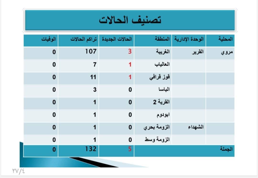 أكدت وزارة الصحة بالولاية الشمالية عن إرتفاع حالات الإصابة بحمي الضنك بمناطق محلية مروي إلي 132 حالة إصابة بعد أن كانت 127 حالة وذلك بعد ظهور الحالات الجديدة في 8 مناطق بمحلية مروي وتم تسجيلها في (الغريبة، العالياب، قوز قرافي) ليبلغ تراكمي الحالات منذ دخول الوباء إلي 132 حالة إصابة ، حيث أعلنت الإدارة العامة للطوارئ الصحية ومكافحة الأوبئة بوزارة الصحة بالشمالية في تقريره التراكمي اليومي لوباء حمى الضنك، عن تسجيل 2 حالة جديدة بحمى الضنك، ليصبح العدد الكلي للحالات منذ دخول الوباء للولاية وتفشت في الغريبة التي سجلت أعلي الحالات بواقع 104 حالة إصابة فيما توزعت بقية الإصابات في (العالياب ، قوز قرافي ، الباسا، القرية 2 أمري ، الأراك ، أبودوم ، الزومة بحري ، الزومة وسط) .