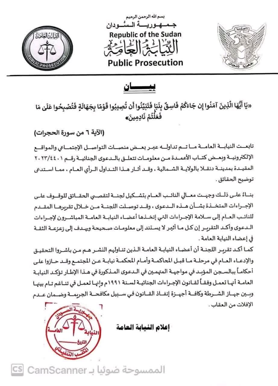 ◾️تابعت النيابة العامة ما تم تداوله عبر بعض منصات التواصل الاجتماعي والمواقع الإلكترونية، وبعض كتاب الأعمدة، من معلومات تتعلق بالدعوى الجنائية رقم (4401 /2023) م، المقيدة بمدينة دنقلا بالولاية الشمالية. وقد أثار هذا التداول الرأي العام، مما استدعى توضيح الحقائق.