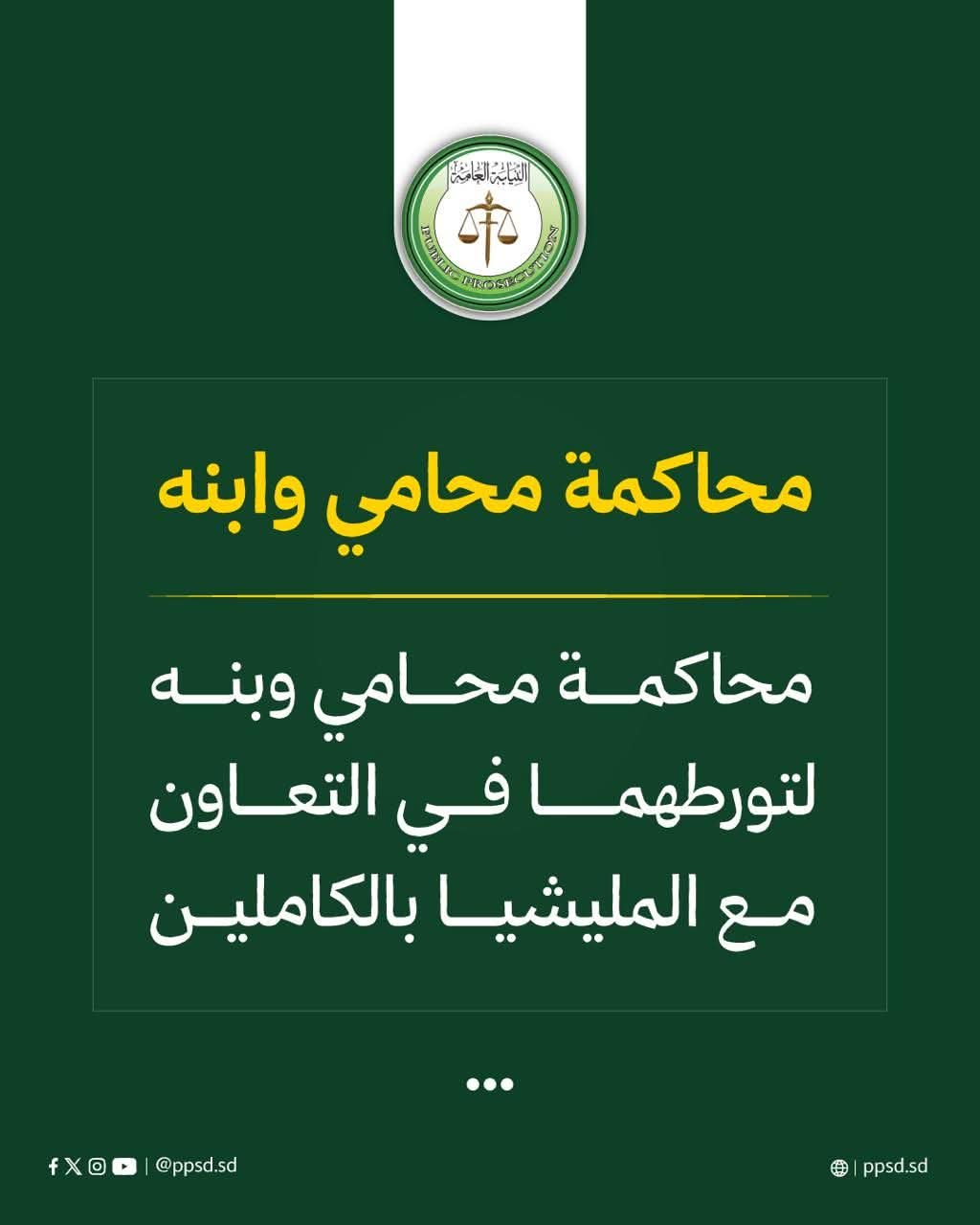 أصدرت محكمة جنايات الإرهاب العامة بمدينة الكاملين أحكاماً بالسجن في مواجهة محامٍ وابنه، بعد إدانتهما بالتعاون مع قوات الدعم السريع المتمردة، في قضية شغلت الرأي العام وظل المواطنون يترقبون الفصل فيها وقضت المحكمة، في الدعوى الجنائية بالرقم (58/2025) بالسجن لمدة (8) سنوات على المتهم الأول (محامٍ) فيما حكمت بالسجن لمدة (10) سنوات على ابنه ، وذلك لمشاركتهما في معاونة قوات الدعم السريع وشن الحرب ضد الدولة ، وتعود تفاصيل البلاغ إلى قيام المتهم الأول وابنه بتقديم الدعم والمساندة للقوات المتمردة، الأمر الذي اعتبرته المحكمة فعلاً يشكل تهديداً لأمن الدولة واستقرارها ، وكانت المحكمة قد استمعت إلى قضيتي الاتهام والدفاع، قبل أن تُصدر حكمها بالإدانة استناداً إلى البينات المقدمة ومثل الاتهام أمام المحكمة وكيل ثاني النيابة السر عبدالله الكريل.