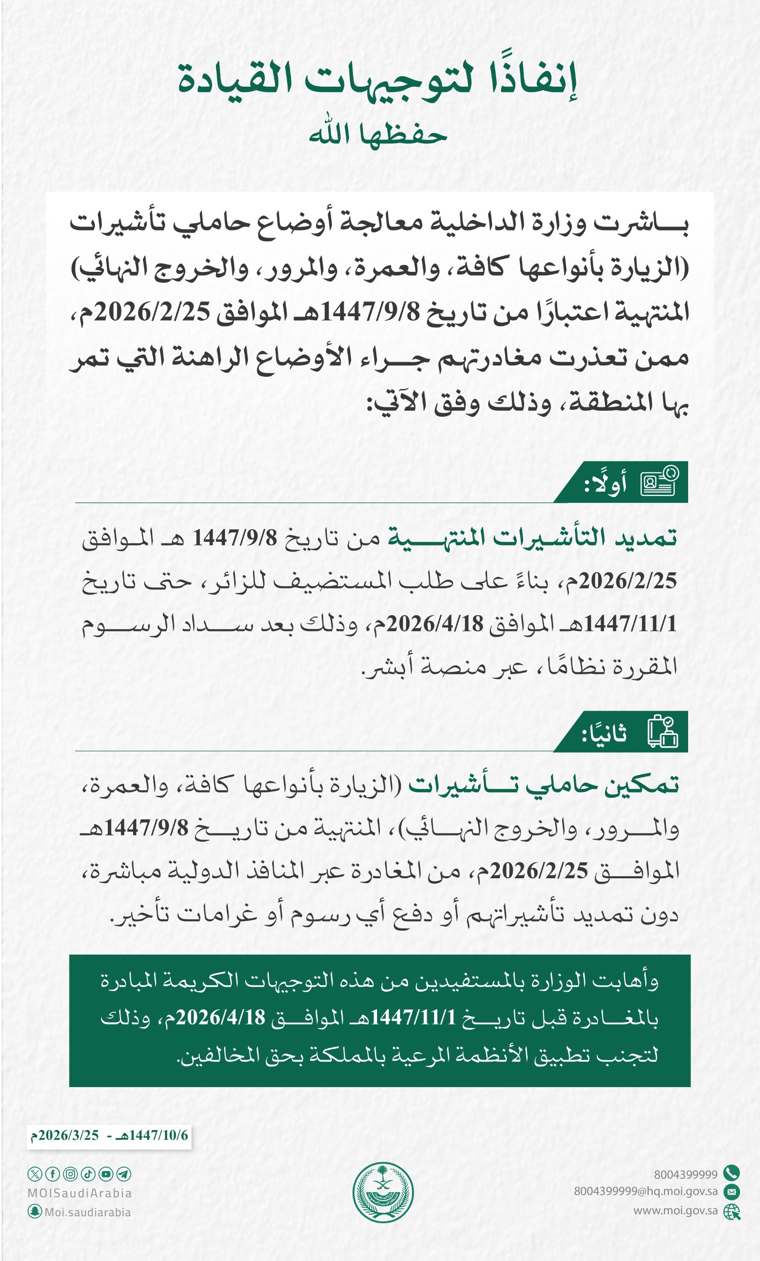 تمكين حاملي تأشيرات (الزيارة بأنواعها كافة، والعمرة، والمرور، والخروج النهائي)، المنتهية من تاريخ 8 / 9 / 1447 هـ الموافق 25 / 2 / 2026 م، من المغادرة عبر المنافذ الدولية مباشرة، دون تمديد تأشيراتهم أو دفع أي رسوم أو غرامات تأخير.