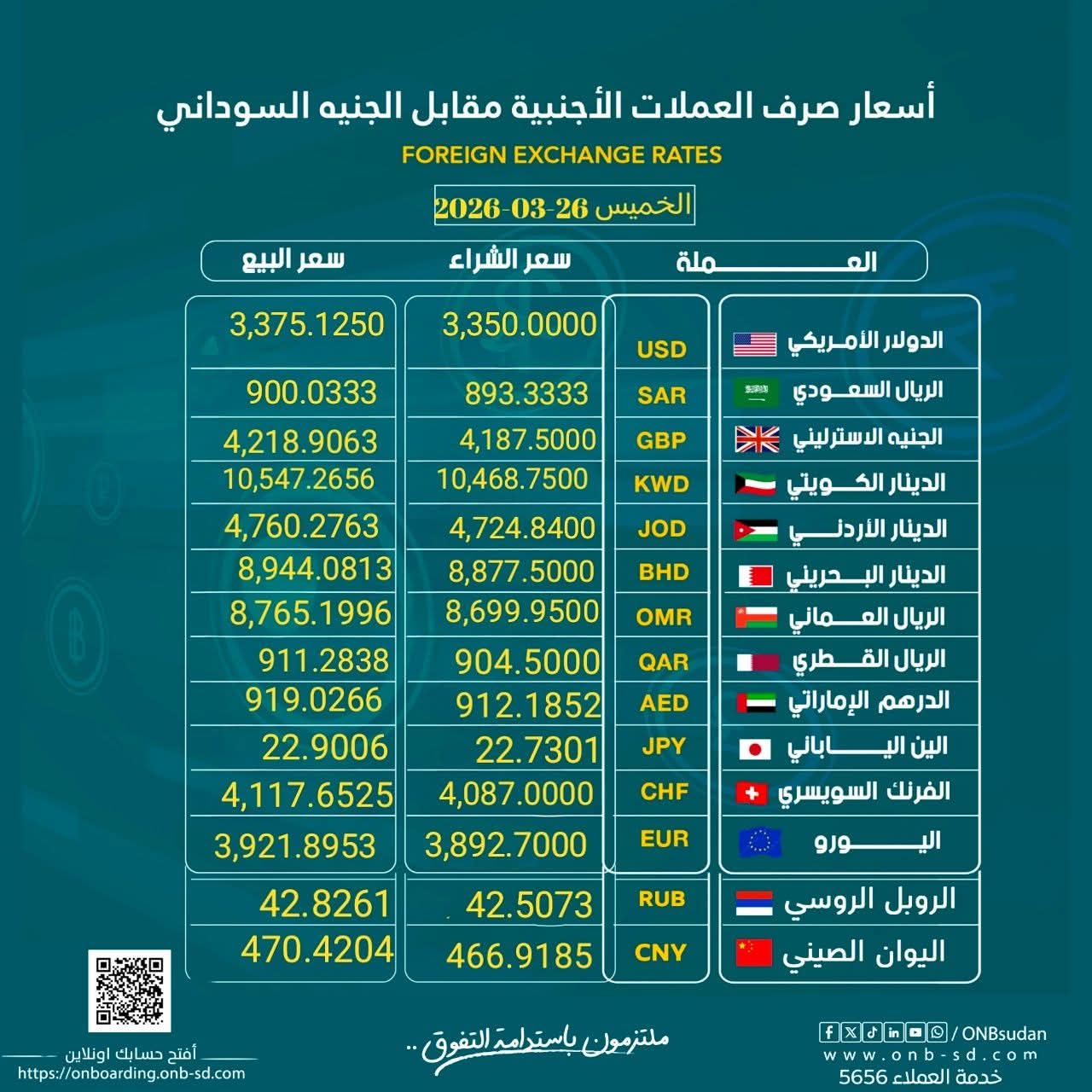 نشرة #أسعار_العملات الأجنبية مقابل الجنيه السوداني من #بنك_أمدرمان_الوطني ليوم الخميس 26 مارس 2026م