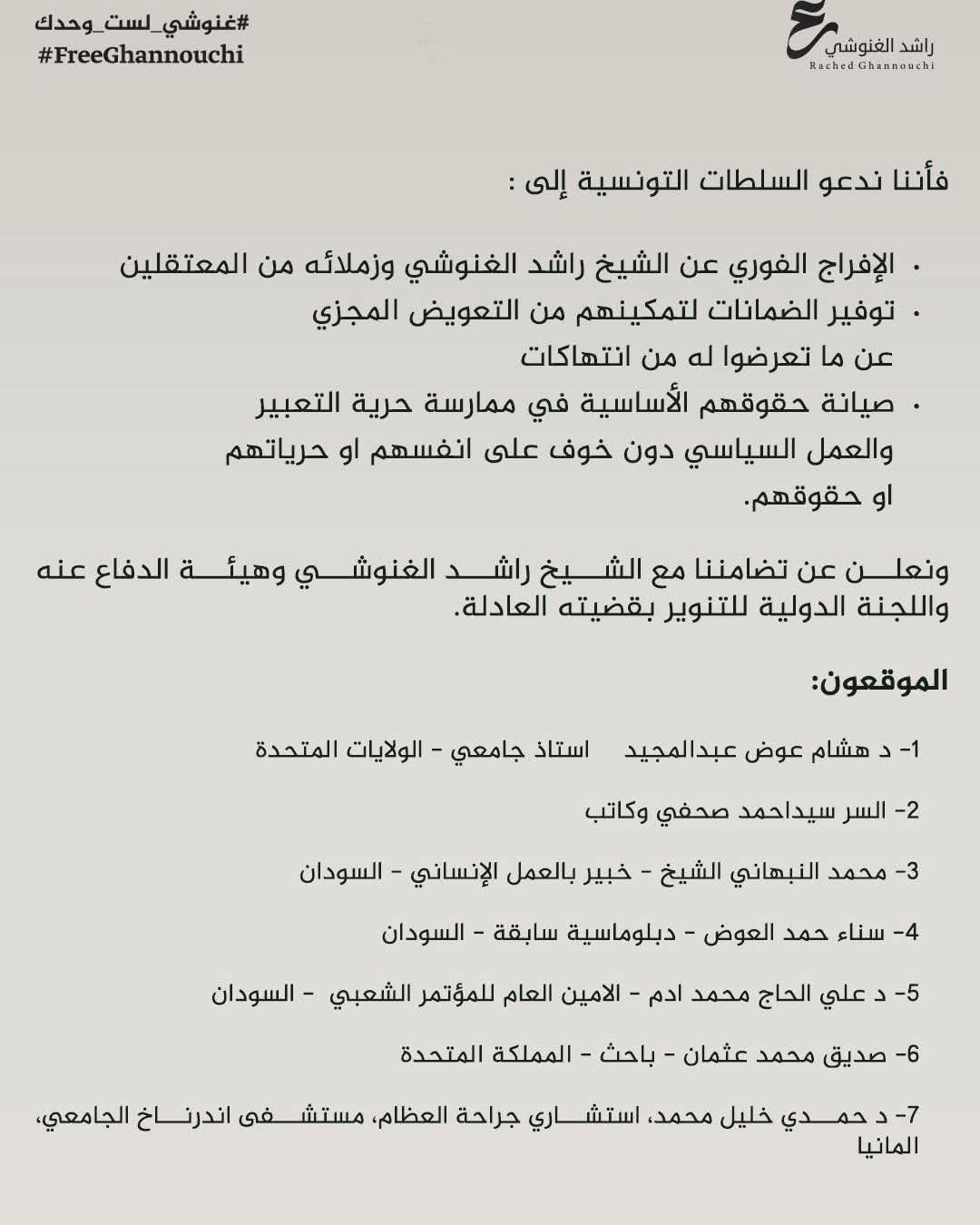 وقع عدد من السياسيين والأكاديميين والإعلاميين السودانيين علي مذكرة تطالب السلطات التونسية بالإفراج الفوري عن زعيم حركة النهضة التونسية الشيخ راشد الغنوشي الشيخ راشد الغنوشي وبقية زملائه المعتقلين مع توفير وضمان التعويض المجزي له وأكد الموقعون علي العريضة أنه وبعد الاطلاع على التقرير الصادر عن فريق الامم المتحدة العامل المعني بالاحتجاز القسري والمتضمن رأيا قانونيا بمخالفة استمرار احتجاز الشيخ راشد الغنوشي ، يطالبون السلطات في تونس بالإطلاق الفوري لسراح الغنوشي، ووقع عن المذكرة كل من (هشام عوض عبد المجيد المحاضر الجامعي بالولايات المتحدة الأمريكية، سناء حمد العوض دبلوماسية سابقة، علي الحاج محمد الأمين العام للمؤتمر الشعبي، الخضر هارون دبلوماسي سابق، صديق محمد عثمان المدير الأسبق لمكتب الشيخ الترابي ، المسلمين البشير الكباشي المدير السابق لمكتب قناة الجزيرة بالسودان، فتح العليم عبد الحي وآخرين) .