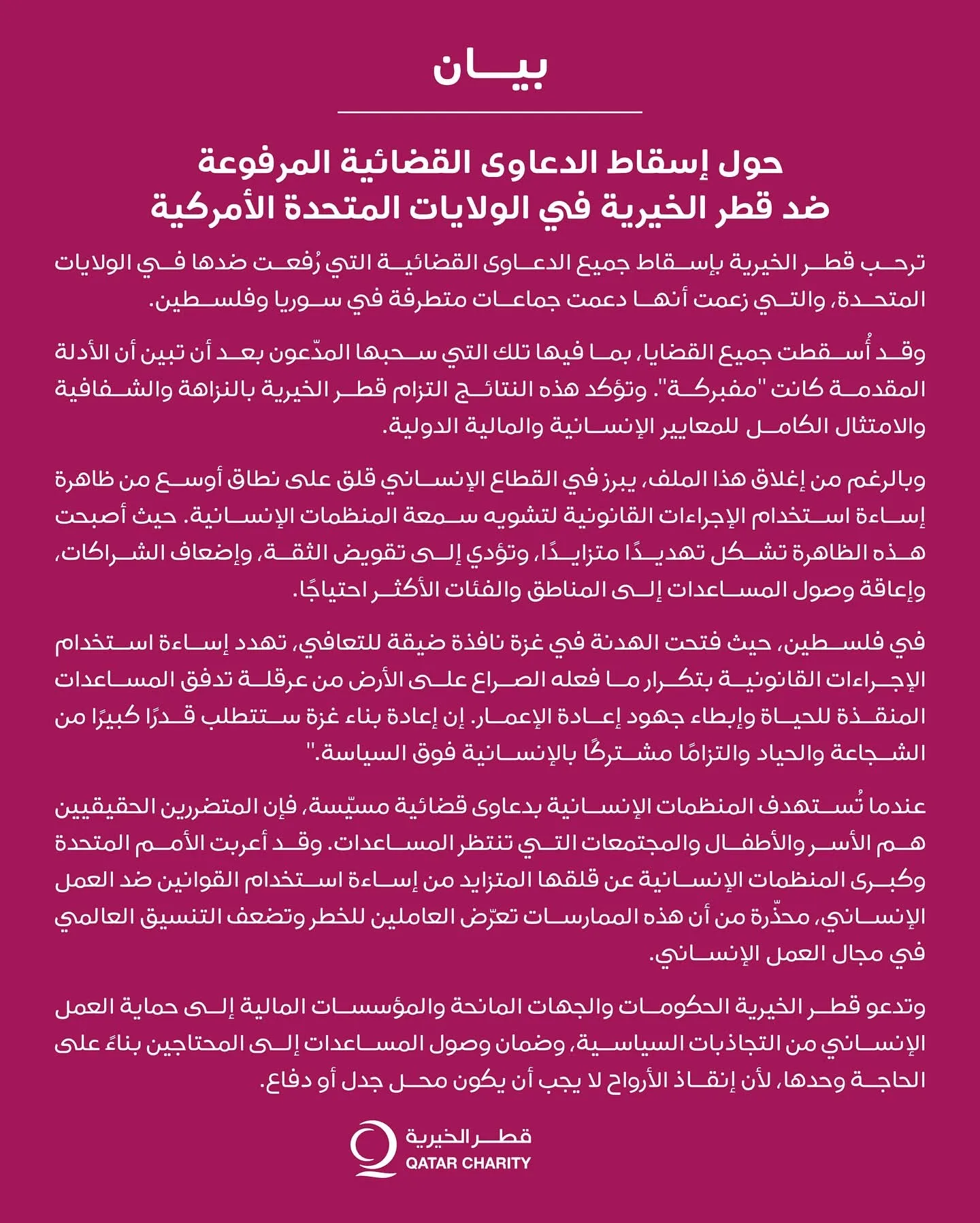 قطر الخيرية تعلن عن إسقاط جميع الدعاوى القضائية المرفوعة ضدها في الولايات المتحدة الأمريكية