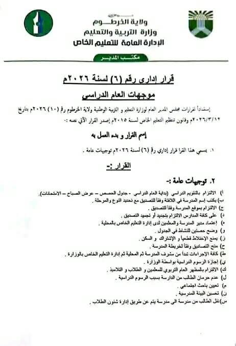 أصدرت وزارة التربية والتعليم بولاية الخرطوم توجيهات جديدة للمدارس الخاصة، في خطوة تعكس توجهًا واضحًا نحو إحكام الرقابة على العملية التعليمية وضبط الممارسات الإدارية والمالية داخل المؤسسات التعليمية الخاصة.