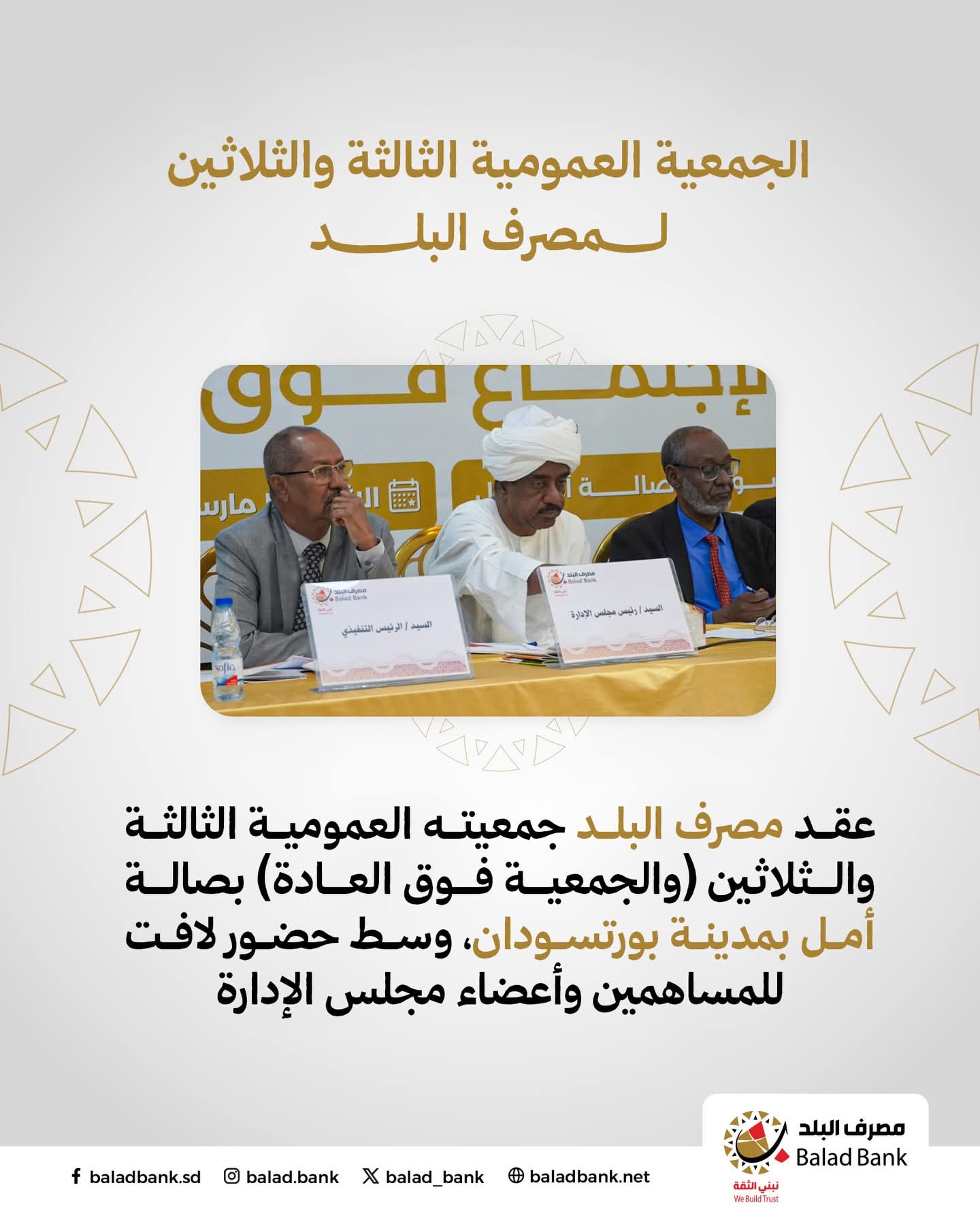 ▪️ عقد مصرف البلد جمعيته العمومية الثالثة والثلاثين (العادية وفوق العادة) بصالة الأمل بمدينة بورتسودان، وسط حضور لافت للمساهمين وأعضاء مجلس الإدارة ، وشهد الاجتماع المصادقة على قرارات استراتيجية كبرى، أبرزها إجازة التقارير المالية لثلاثة أعوام متتالية (2022، 2023، 2024)، وانتخاب مجلس إدارة جديد للدورة (2026 – 2029)م