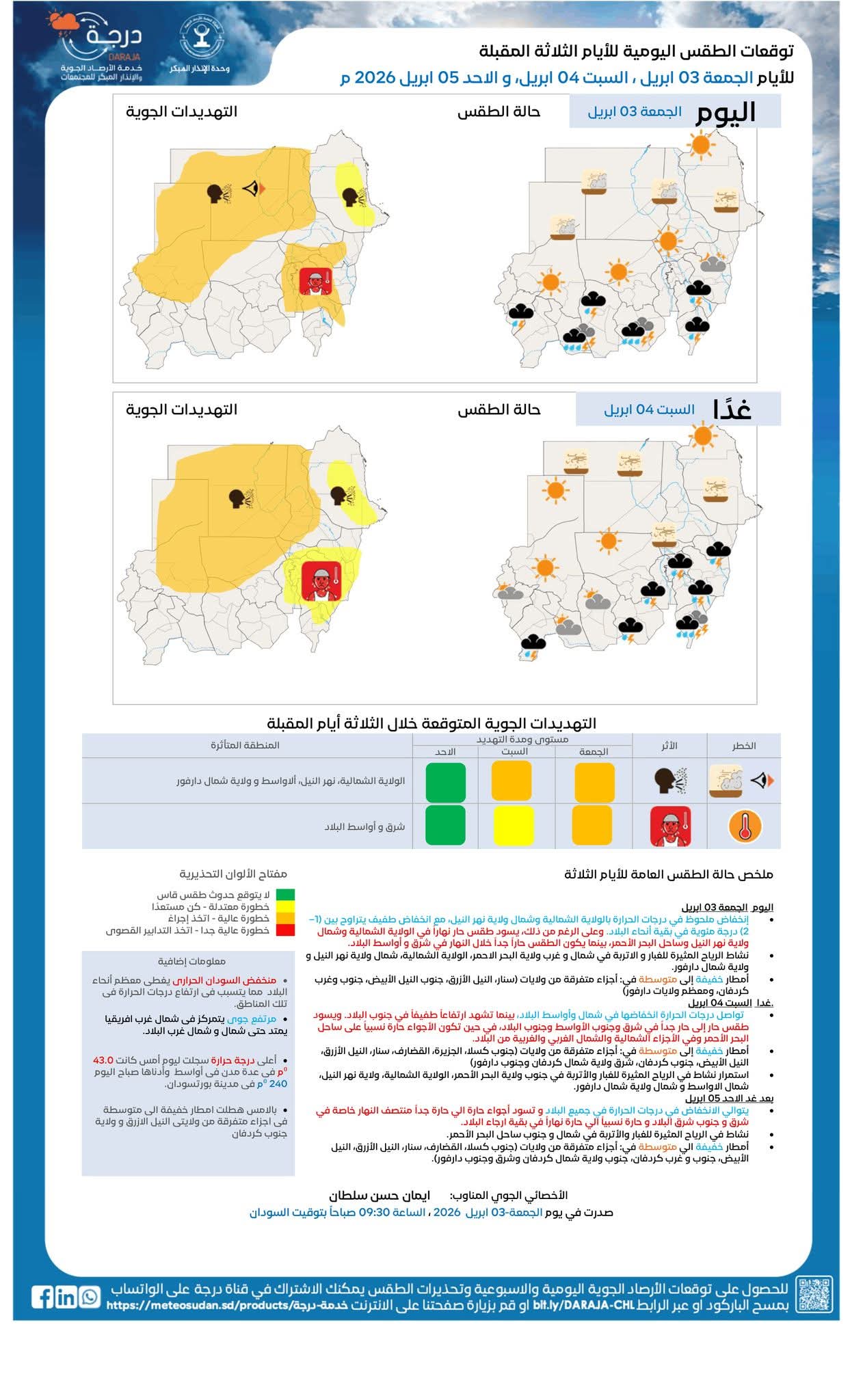 نشرت الهيئة العامة للأرصاد الجوية تقريرها عن توقعات الطقس اليومية للأيام الثلاثة المقبلة وأصدرت نشرتها الخاصة بتقلبات الأحوال الجوية اليوم الجمعة وغداً السبت وبعد غد الاحد وتوقعت الهيئة إنخفاضاً ملحوظاً في درجات الحرارة بالولاية الشمالية وشمال ولاية نهر النيل، مع انخفاض طفيف يتراوح بين (1–2) درجة مئوية في بقية أنحاء البلاد ، وعلى الرغم من ذلك، يسود طقس حار نهاراً في الولاية الشمالية وشمال ولاية نهر النيل وساحل البحر الأحمر، بينما يكون الطقس حاراً جداً خلال النهار في شرق و أواسط البلاد، مع نشاط الرياح المثيرة للغبار والاتربة في جنوب وغرب ولاية البحر الاحمر، الولاية الشمالية، ولاية نهر النيل و ولاية شمال دارفور، وهطول أمطار خفيفة إلى متوسطة في أجزاء متفرقة من ولايات (سنار، النيل الأزرق، جنوب النيل الأبيض، جنوب وغرب كردفان، ومعظم ولايات دارفور) ، وبشأن أحوال الطقس يوم غد السبت ، توقعت الهيئة أن تواصل درجات الحرارة انخفاضها في شمال وأواسط البلاد، بينما تشهد ارتفاعاً طفيفاً في جنوب البلاد ، حيث يسود طقس حار إلى حار جداً في شرق وجنوب الأواسط وجنوب البلاد، في حين تكون الأجواء حارة نسبياً على ساحل البحر الأحمر وفي الأجزاء الشمالية والشمال الغربي والغربية من البلاد ، مع توقعات بهطول أمطار خفيفة إلى متوسطة في أجزاء متفرقة من ولايات (جنوب كسلا، الجزيرة، القضارف، سنار، النيل الأزرق، النيل الأبيض، جنوب كردفان، شرق ولاية شمال كردفان وجنوب دارفور) ، مع استمرار نشاط في الرياح المثيرة للغبار والأتربة في جنوب ولاية البحر الأحمر، الولاية الشمالية، ولاية نهر النيل، شمال الاواسط و ولاية شمال دارفور ، وفي يوم الاحد 5 ابريل توقعت الهيئة أن توالي درجات الانخفاض في جميع البلاد ، حيث تسود أجواء حارة الي حارة جداً منتصف النهار خاصة في شرق وجنوب شرق البلاد و حارة نسبياً الي حارة نهاراً في بقية ارجاء البلاد ، مع هطول أمطار خفيفة الي متوسطة في أجزاء متفرقة من ولايات (جنوب كسلا، القضارف، سنار، النيل الأزرق، النيل الأبيض، جنوب و غرب كردفان، جنوب ولاية شمال كردفان وشرق وجنوب دارفور) ، نشاط في الرياح المثيرة للغبار والأتربة في شمال و جنوب ساحل البحر الأحمر.