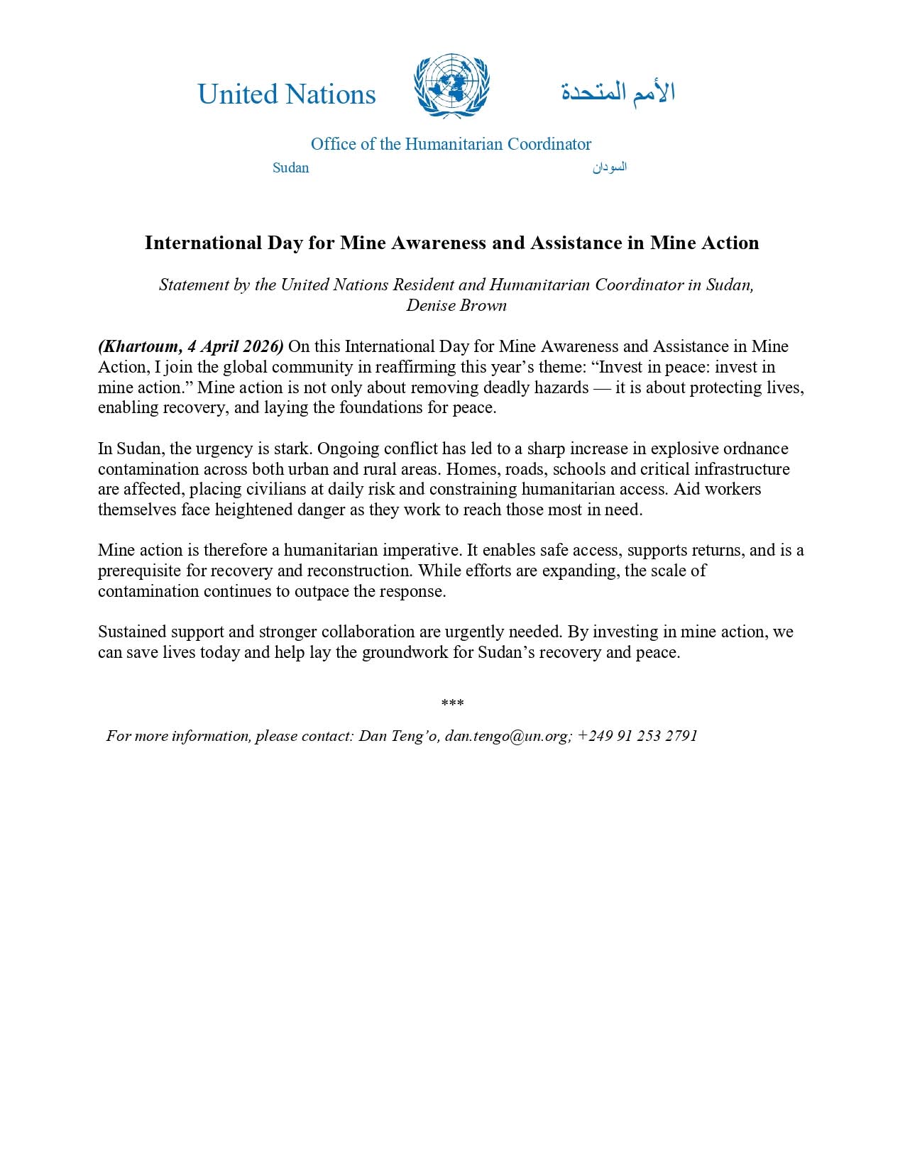 الخرطوم، 4 أبريل 2026م | في هذا اليوم الدولي للتوعية بمخاطر الألغام والمساعدة في الأعمال المتعلقة بالألغام، أنضم إلى المجتمع الدولي في تأكيد موضوع هذا العام: «الاستثمار في السلام : الاستثمار في الأعمال المتعلقة بالألغام».