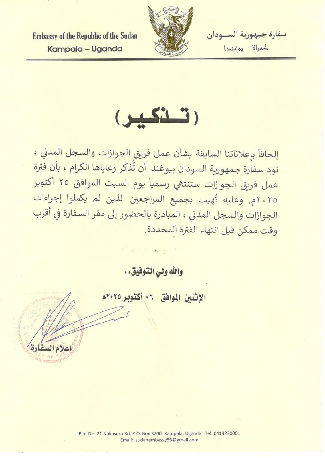 أوضحت مصادر مطلعة في كمبالا عدم وجود معاملات قنصلية تتعلق بإجراءات إستخراج أو تجديد جوازات الرعايا السودانيين في السفارة السودانية بيوغندا مؤكدة في ذات الوقت عدم وجود بعثة لإستخراج وتجديد الجوازات بالسفارة